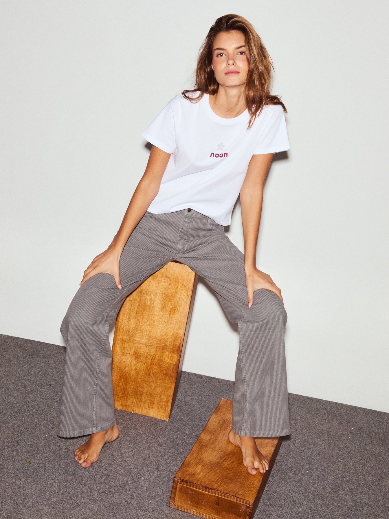 Jeans de Tiro Alto de Rayas en Color Gris. De corte recto y pernera ancha. Cuatro bolsillos con logo de noon bordado en el bolsillo trasero. ¡Se convertirá en un imprescindible para tus looks esta temporada!