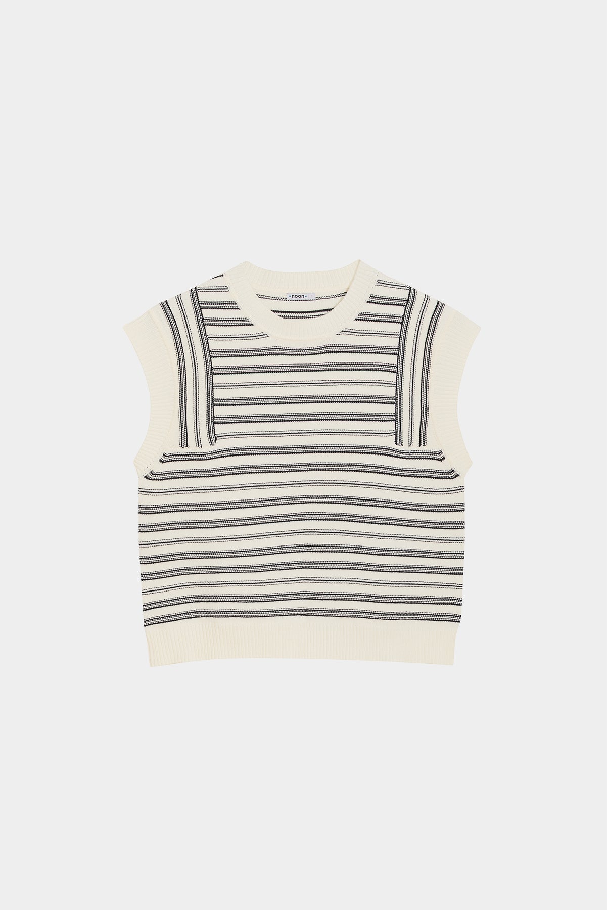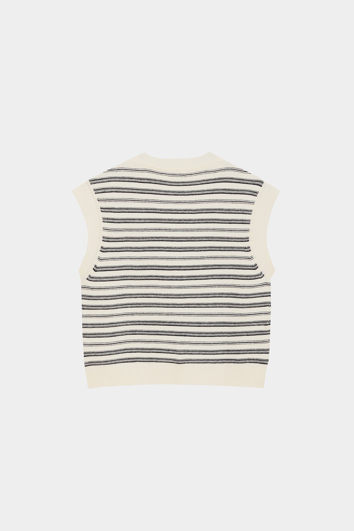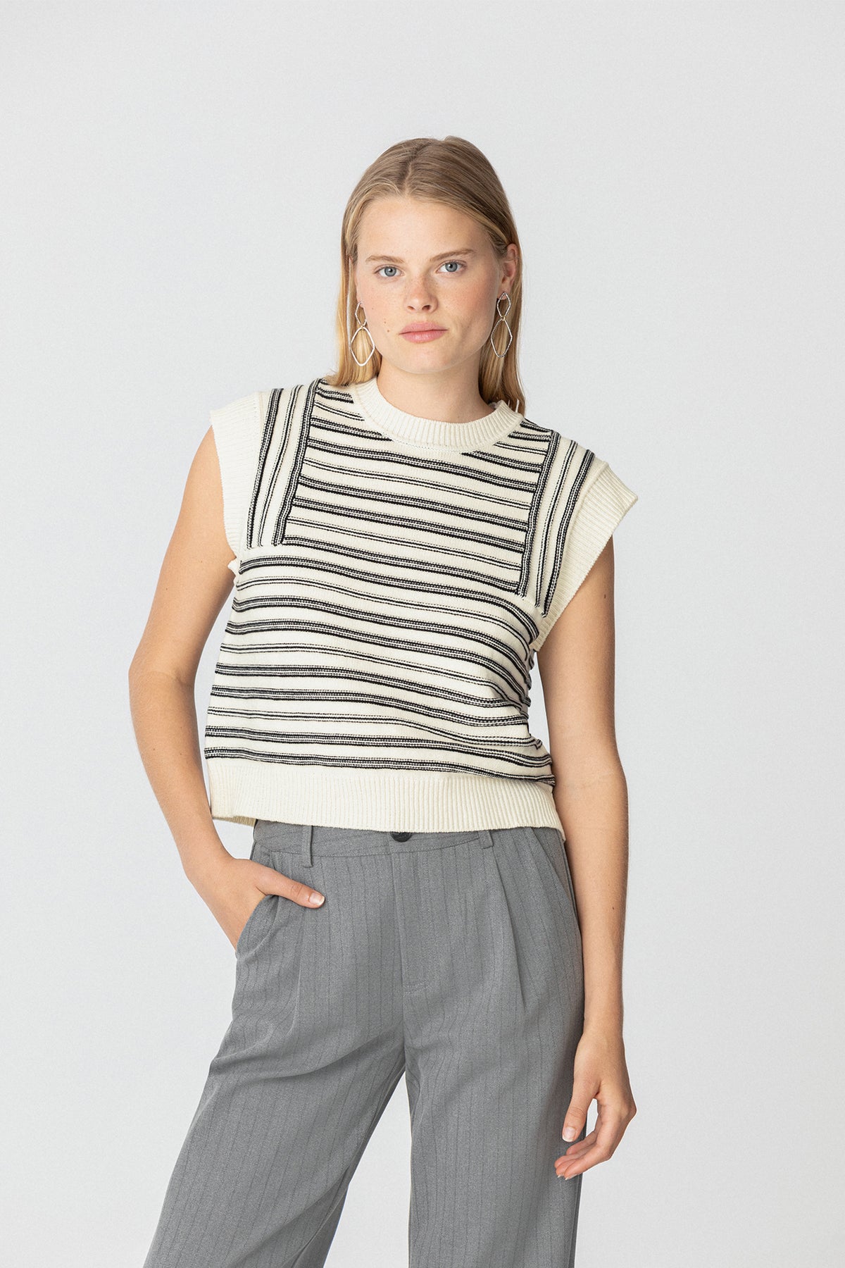 Colete às riscas cru sem mangas. Malha macia e elástica. O complemento ideal para o seu look do dia a dia. Combine-a com qualquer uma das nossas blusas e marque tendência!