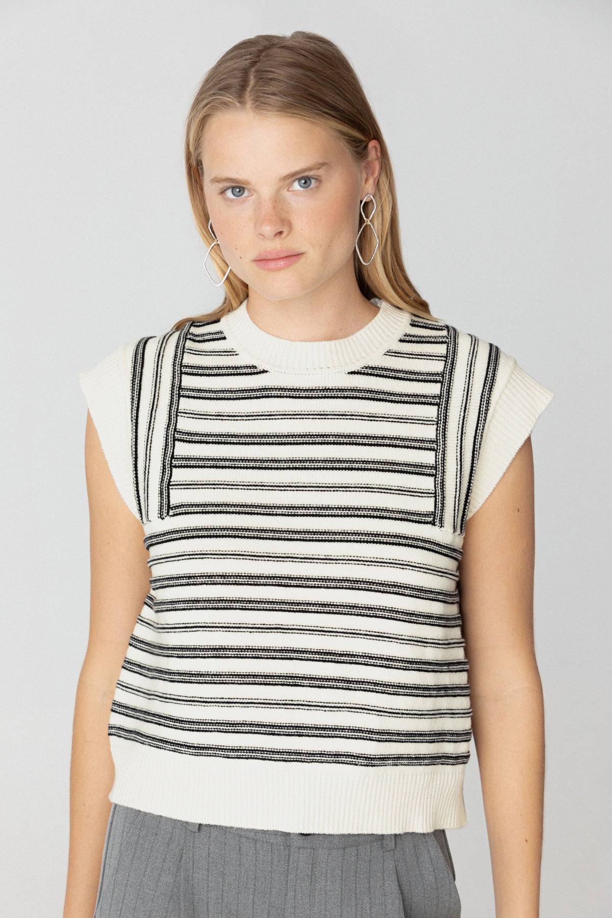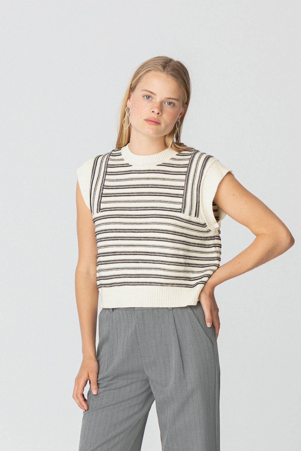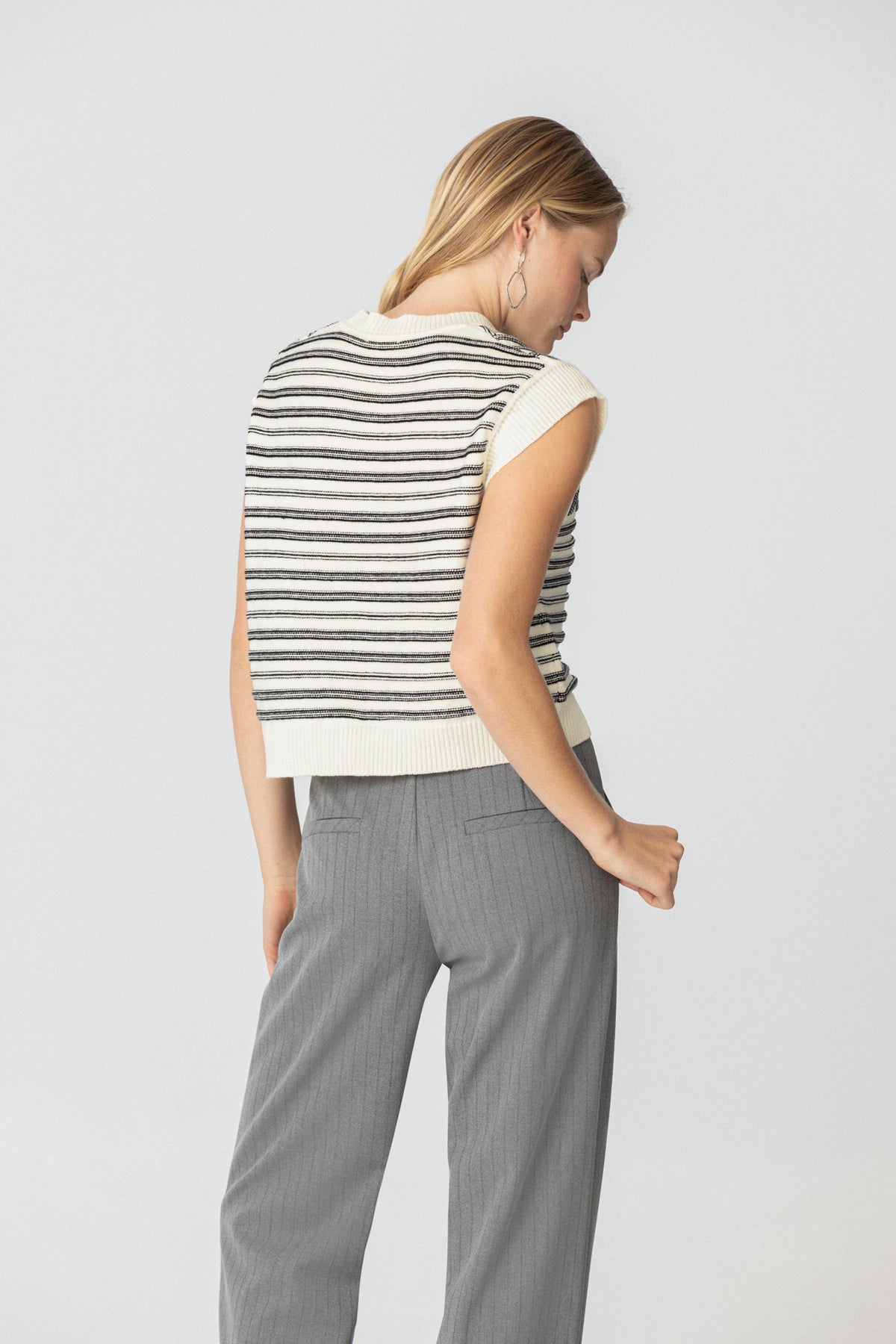 Colete às riscas cru sem mangas. Malha macia e elástica. O complemento ideal para o seu look do dia a dia. Combine-a com qualquer uma das nossas blusas e marque tendência!