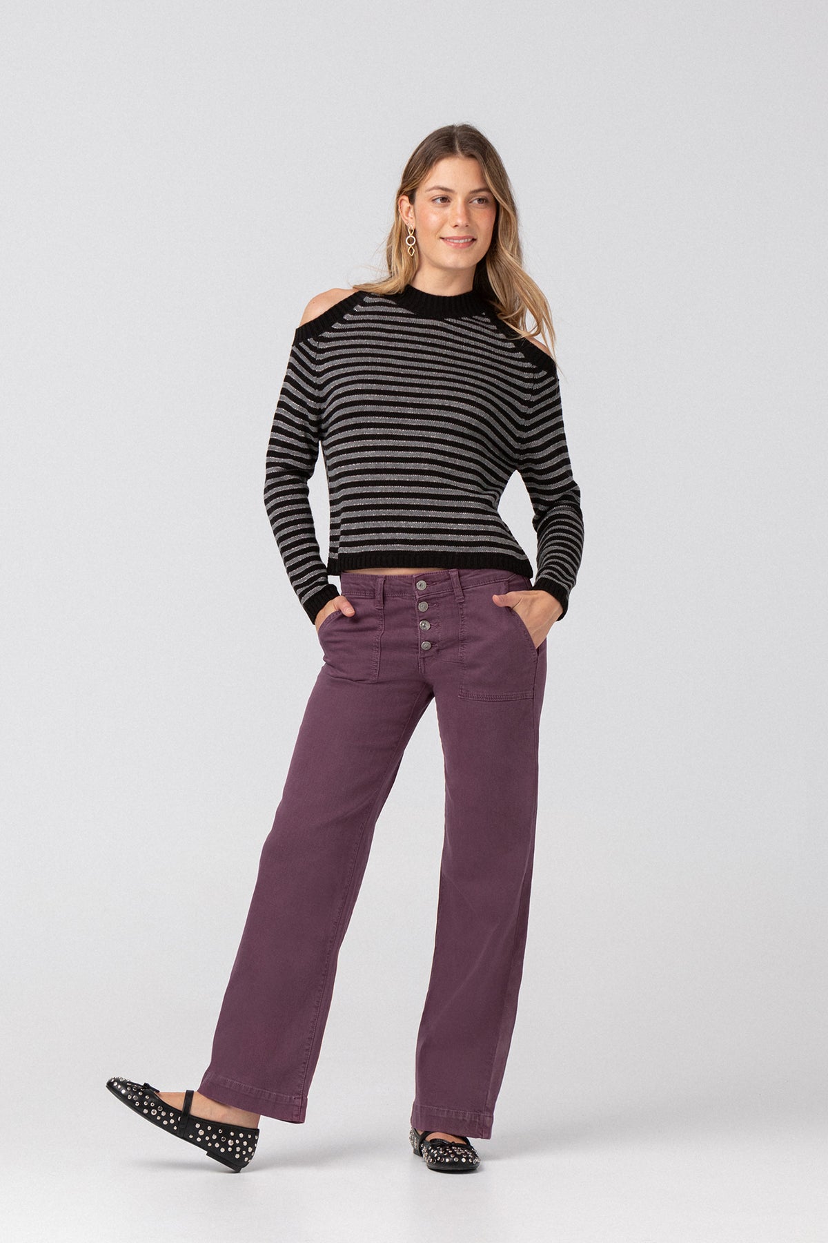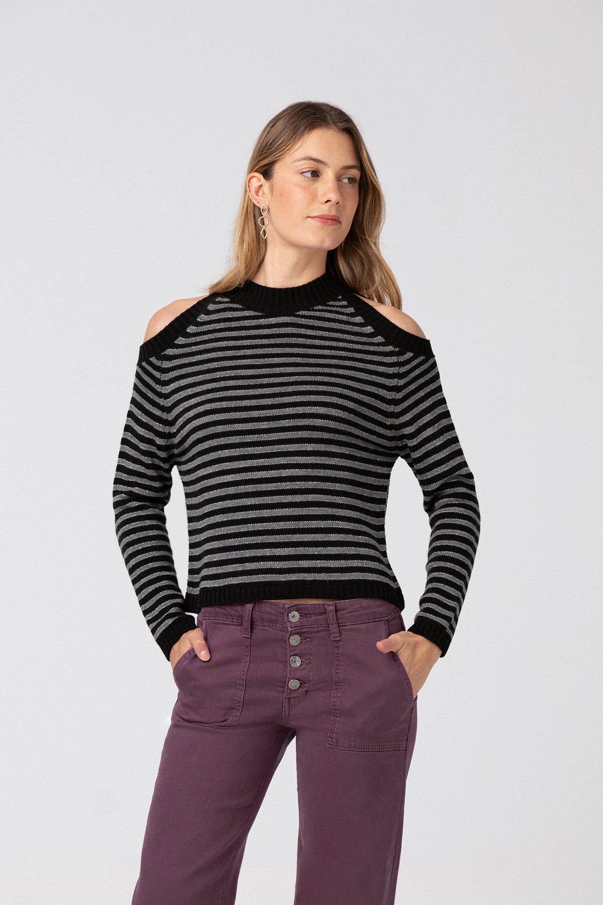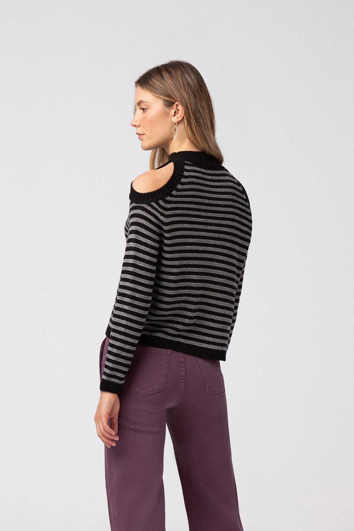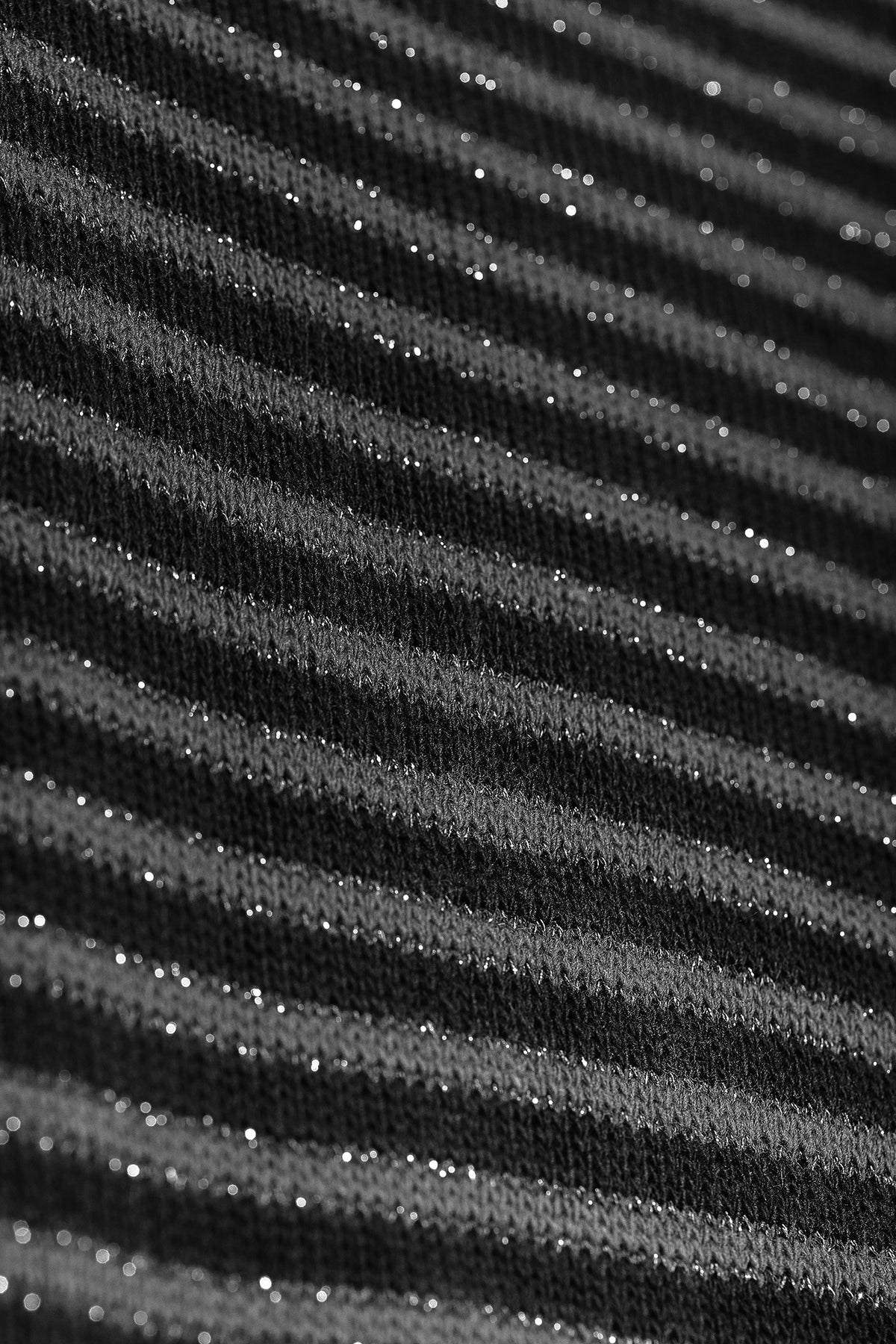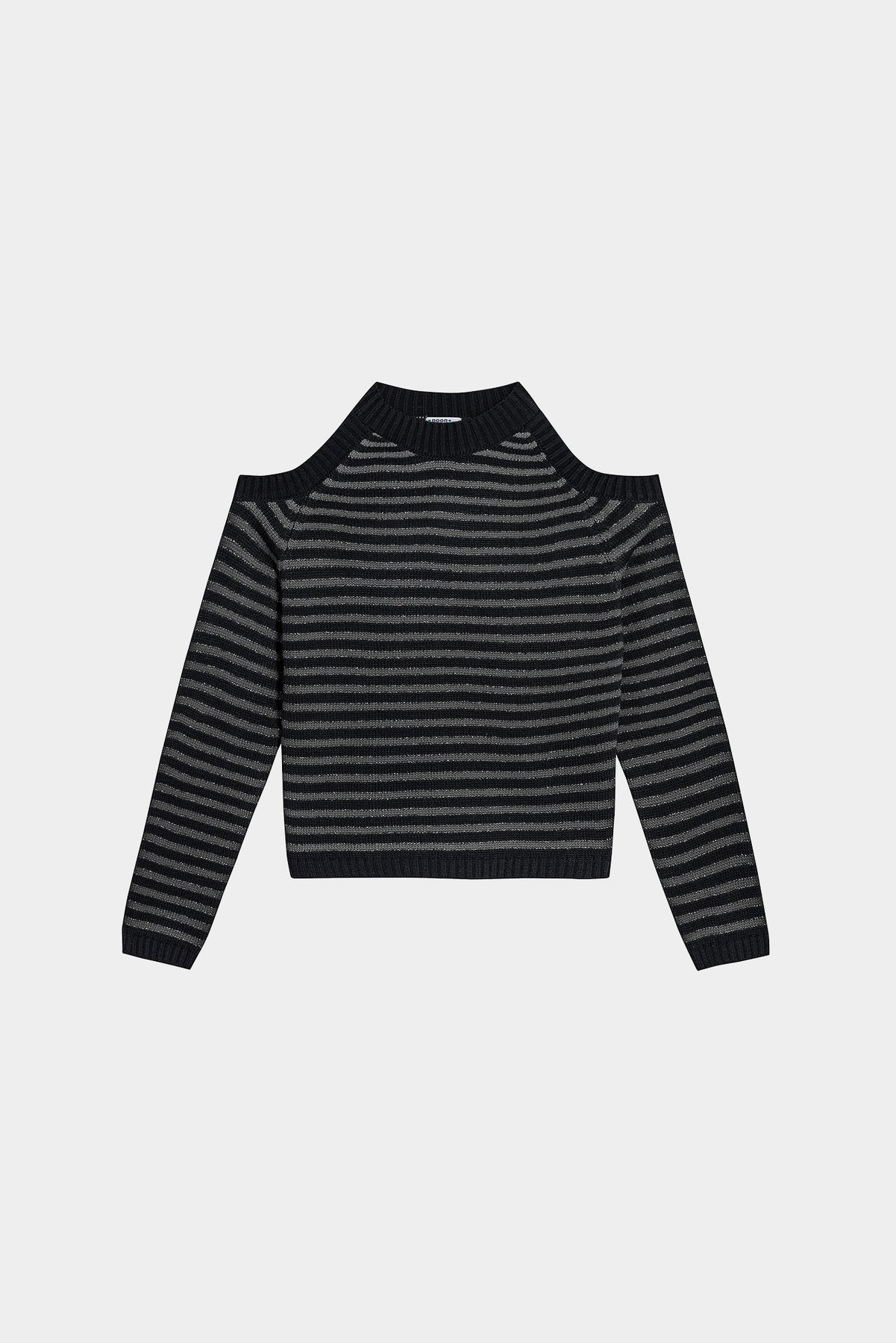 Camisola de gola redonda às riscas com ombros descobertos. O tecido Lurex acrescenta um toque diferente à peça. Disponível em azul e preto, para que possa escolher o seu favorito!