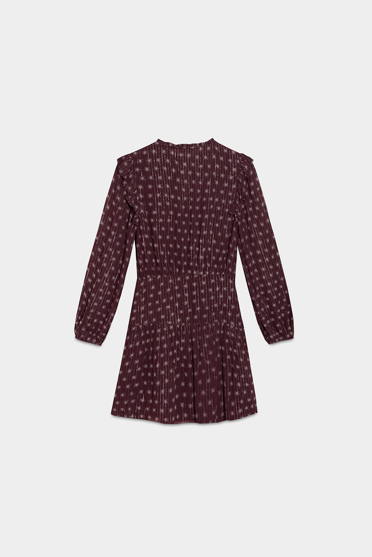 Vestido curto de manga comprida com estampado bordeaux. Decote em V e atilhos para um ajuste perfeito. Ideal para qualquer ocasião especial. Combine com as nossas botas de cowboy para um look moderno!