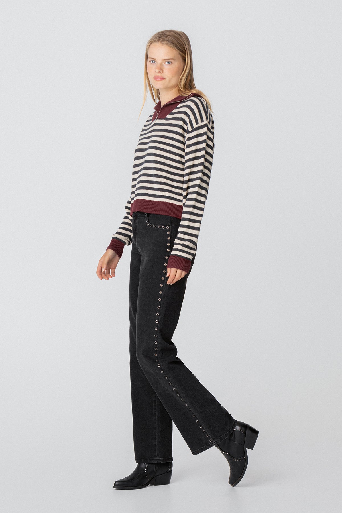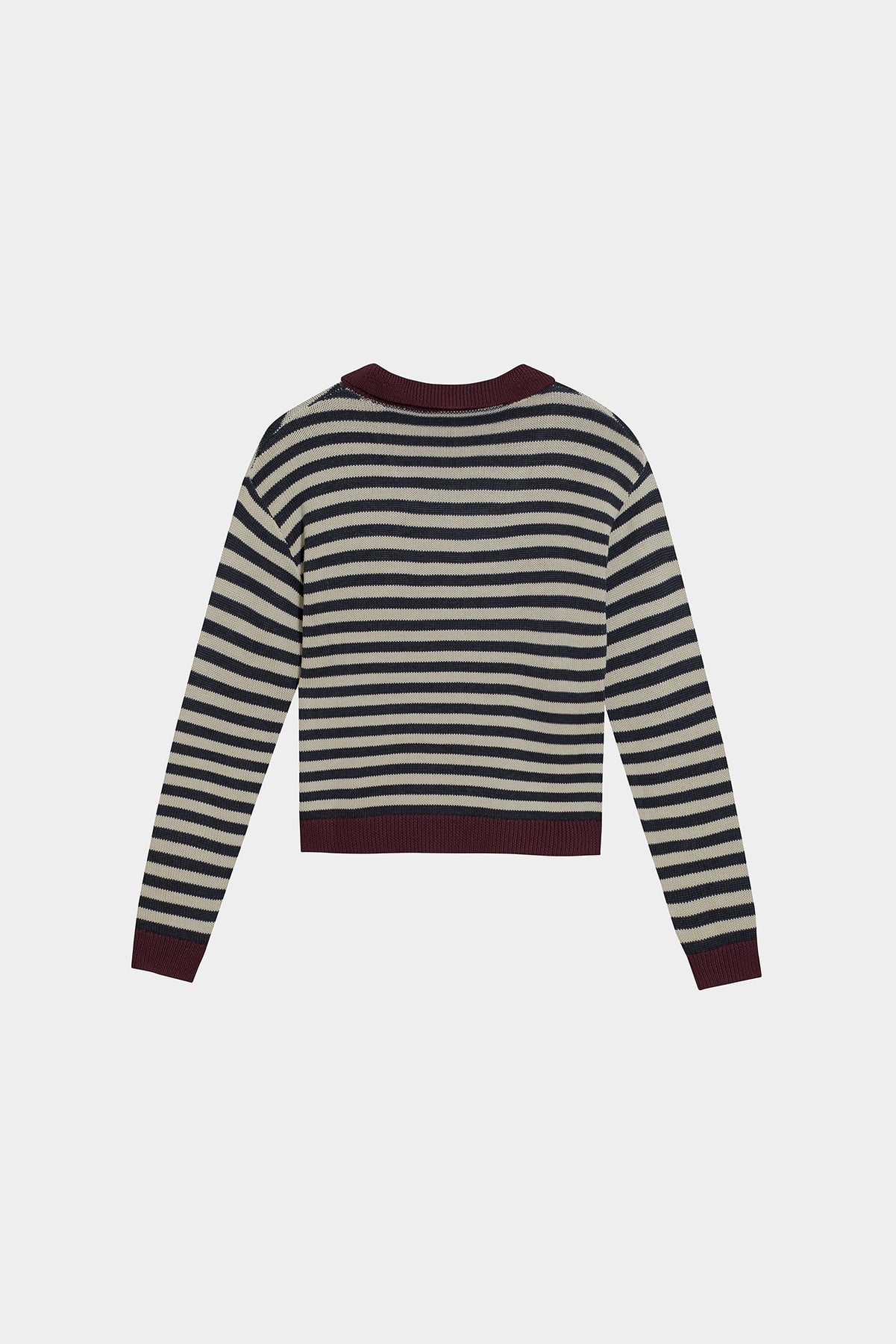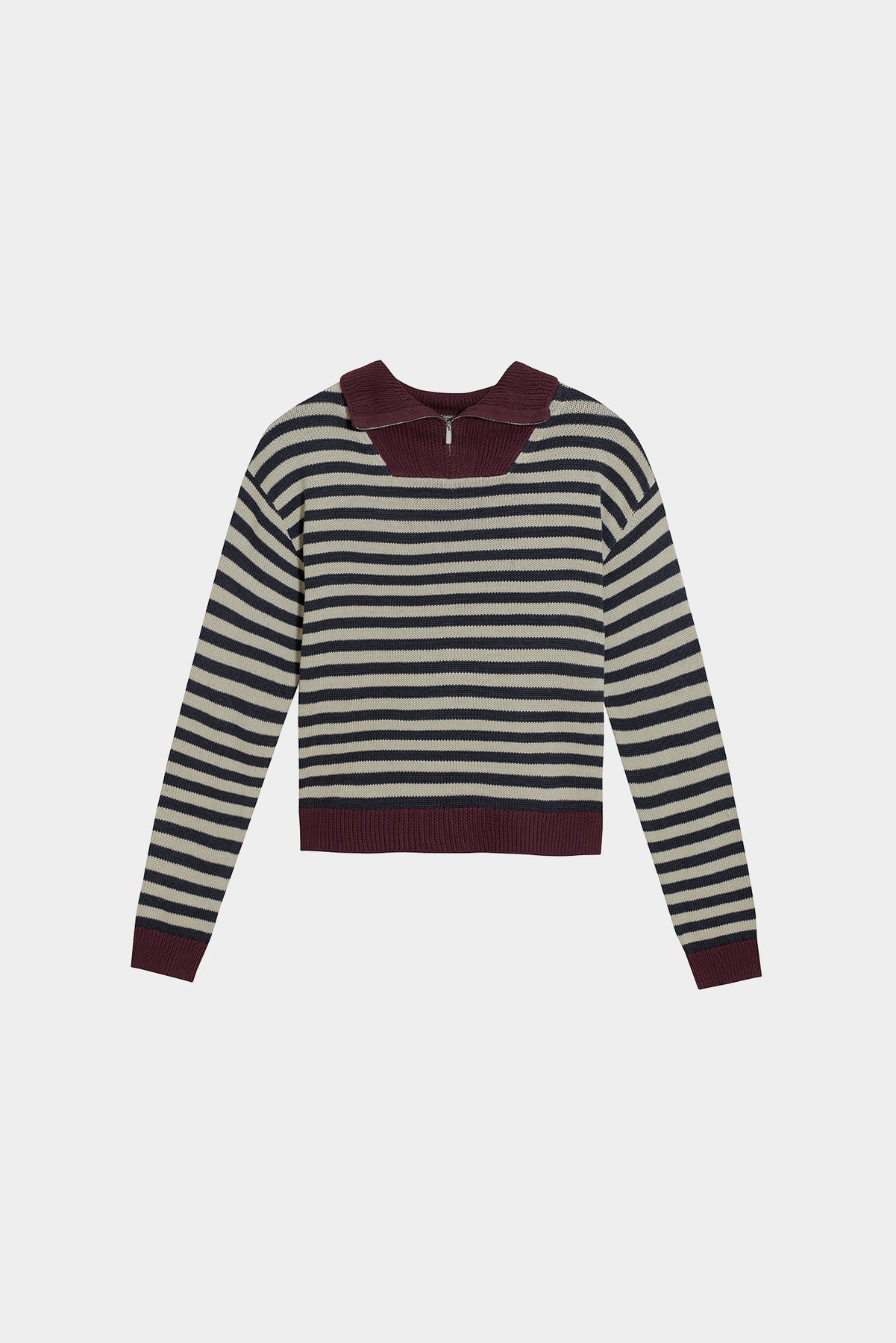 Camisola listrada de tricô. Decote com fecho. Punhos elásticos para um ajuste perfeito. A cor bordeaux , tendência da estação. Combine como quiser!