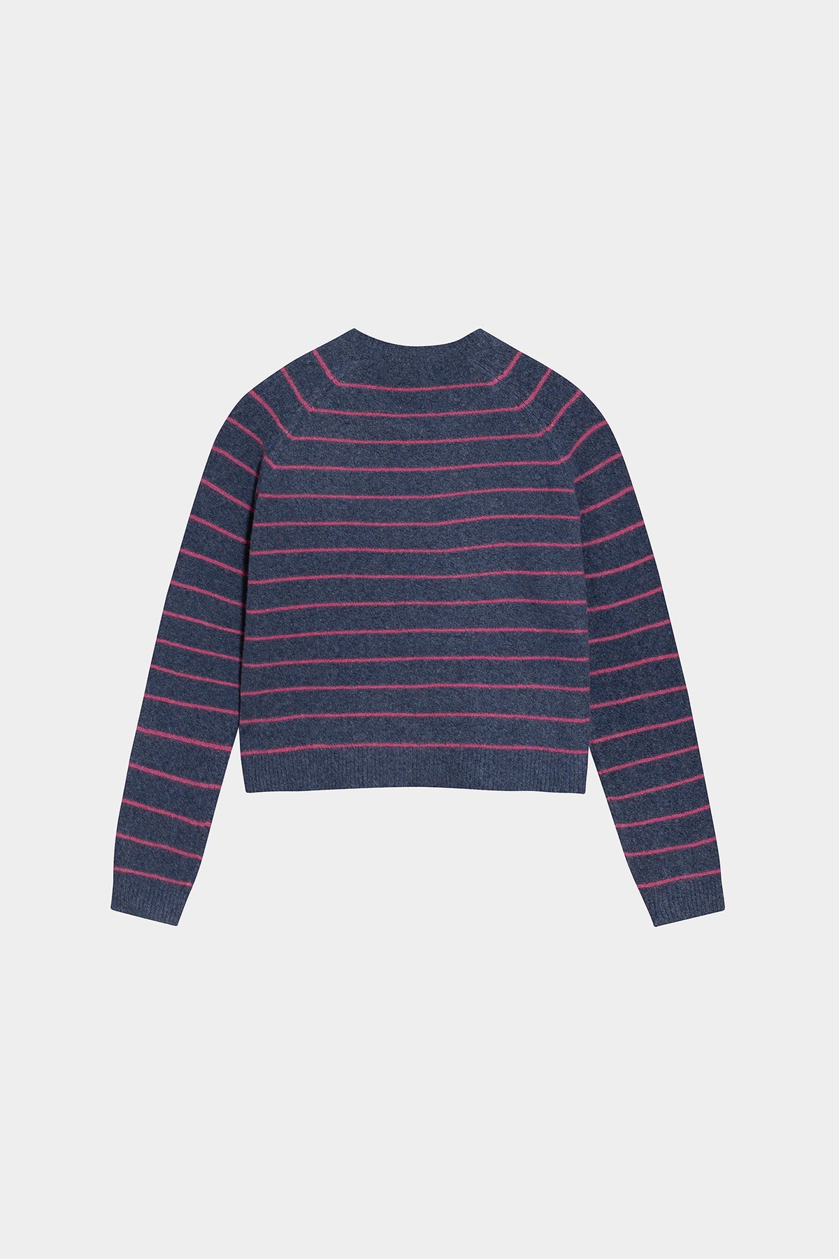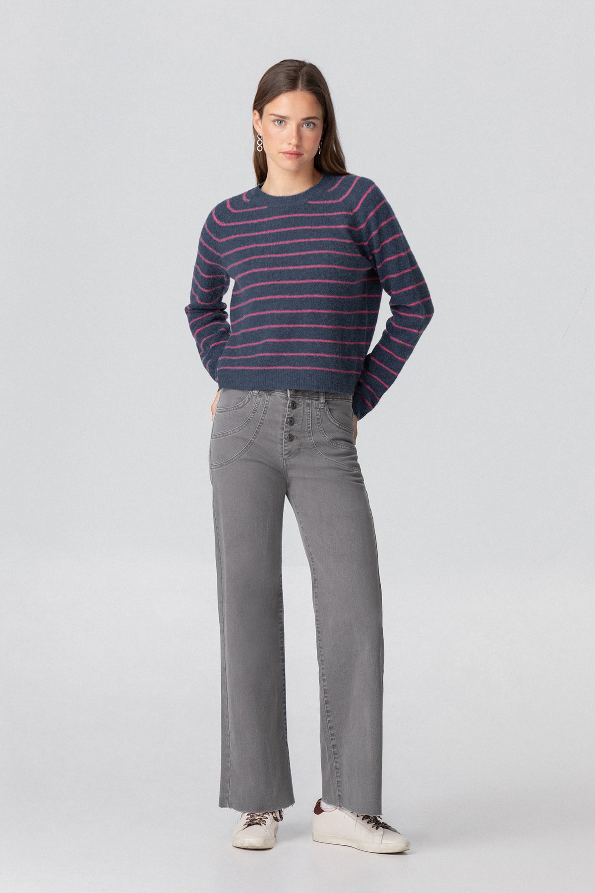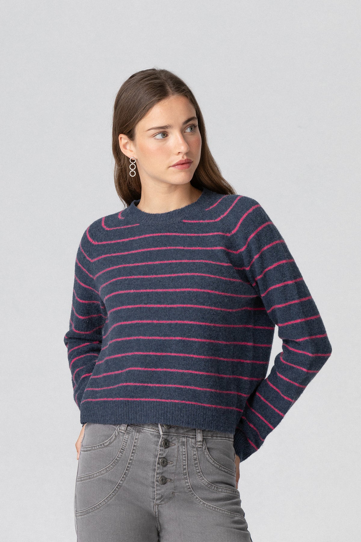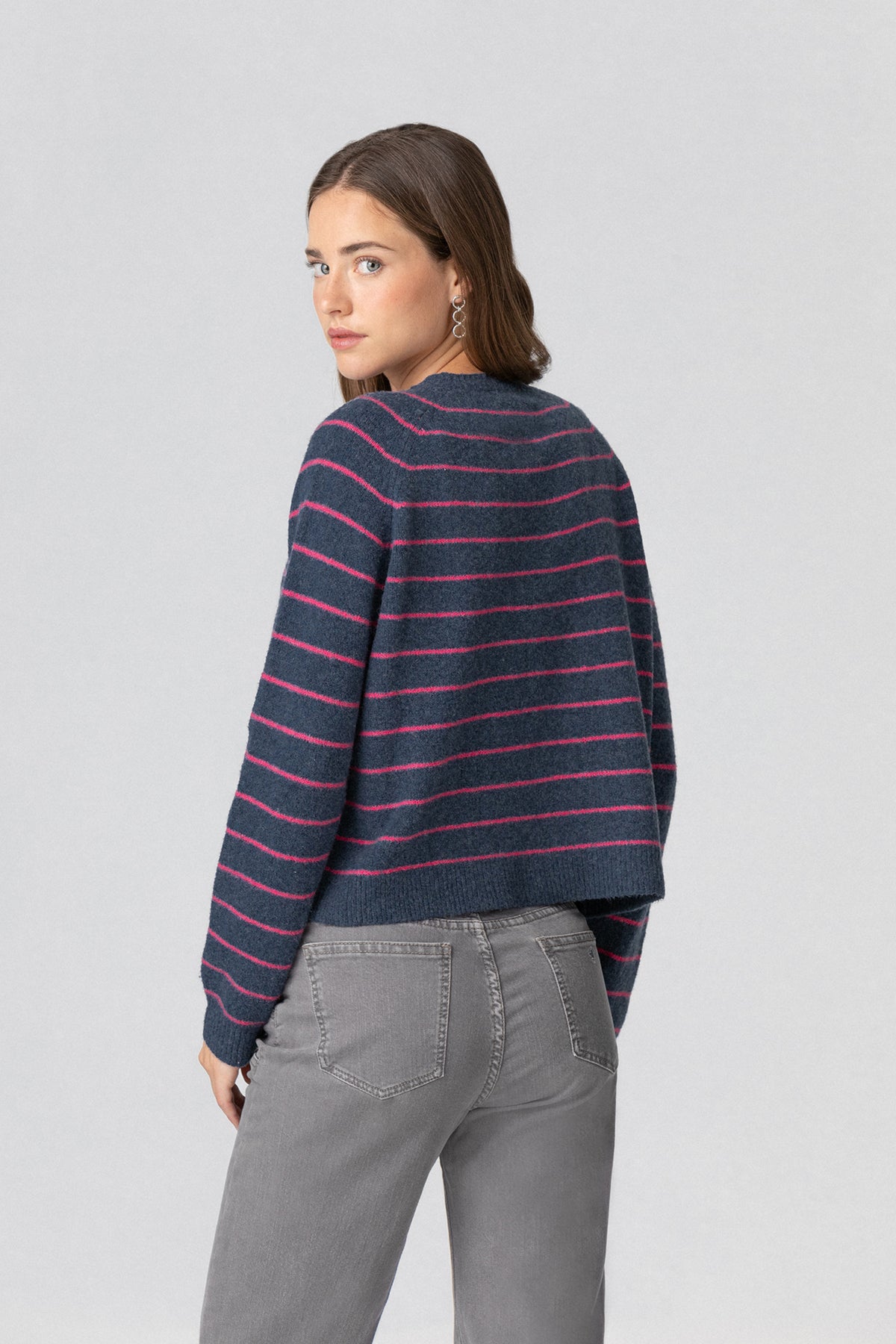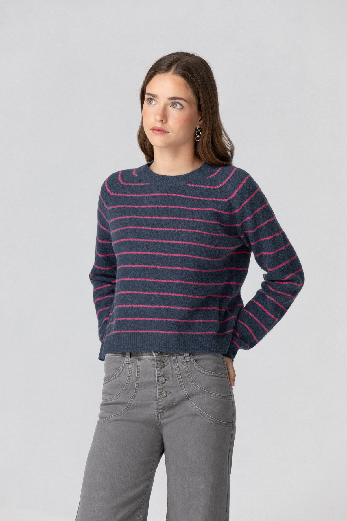 Camisola listrada de manga comprida. Gola redonda, tecido macio e riscas rosa contrastantes. Disponível em duas cores para Escolha o seu favorito. Tornar-se-á um item essencial nesta temporada. Adquira já!