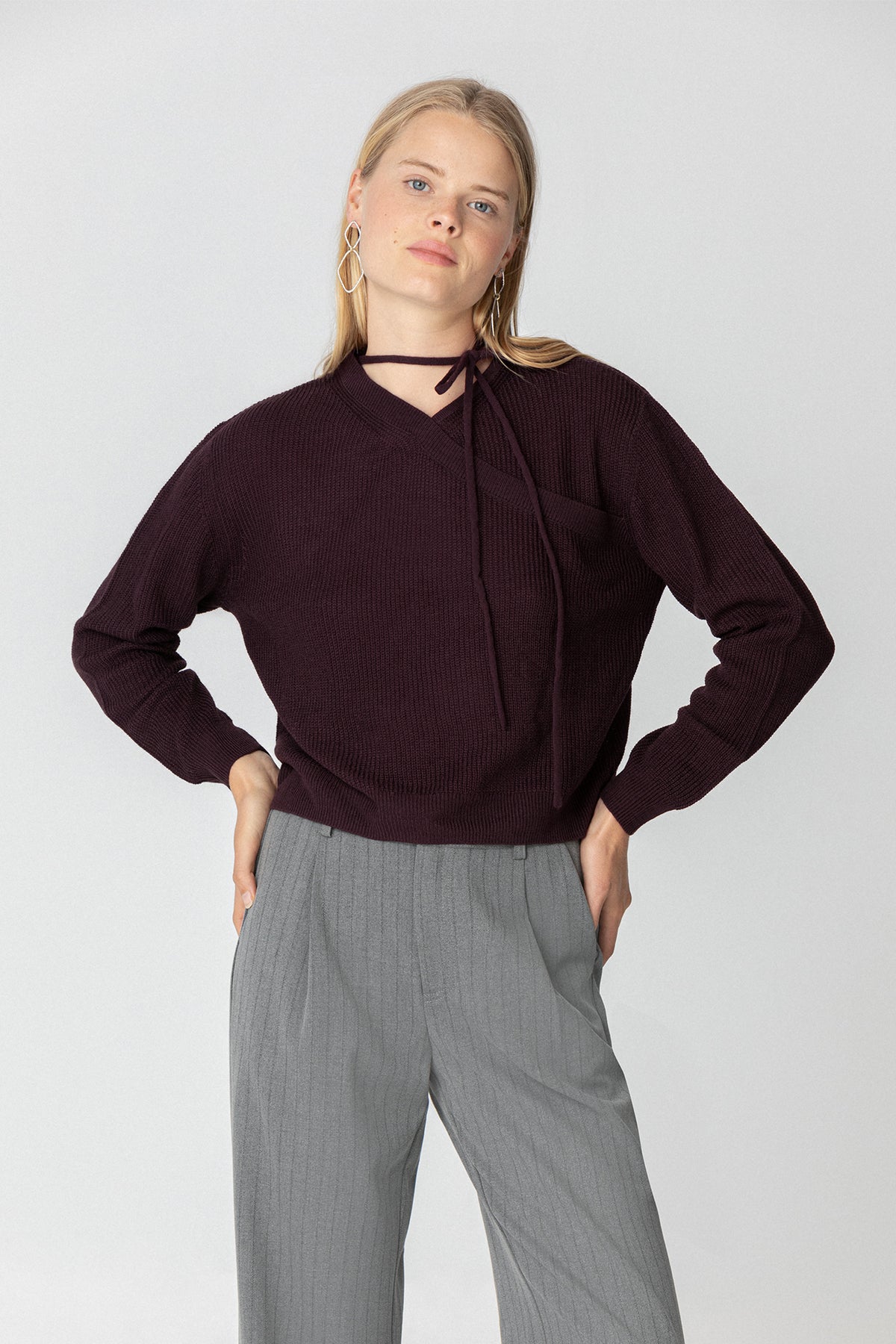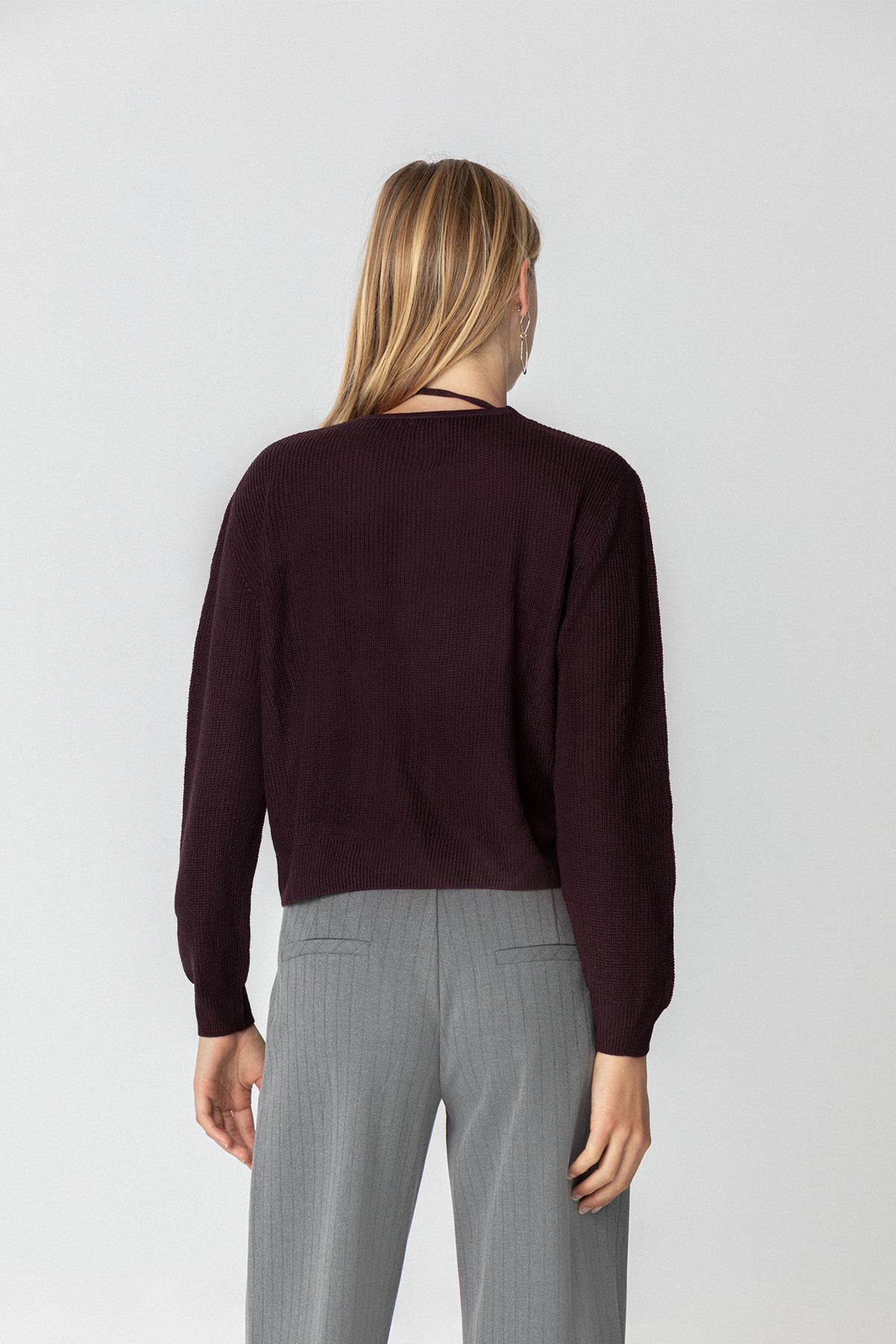 Camisola de manga comprida com laço cor beringela. Detalhe original e moderno de laço estilo gargantilha no pescoço. Macio e Elástico com ajuste perfeito. Dê um toque único ao seu look. Adquira já!