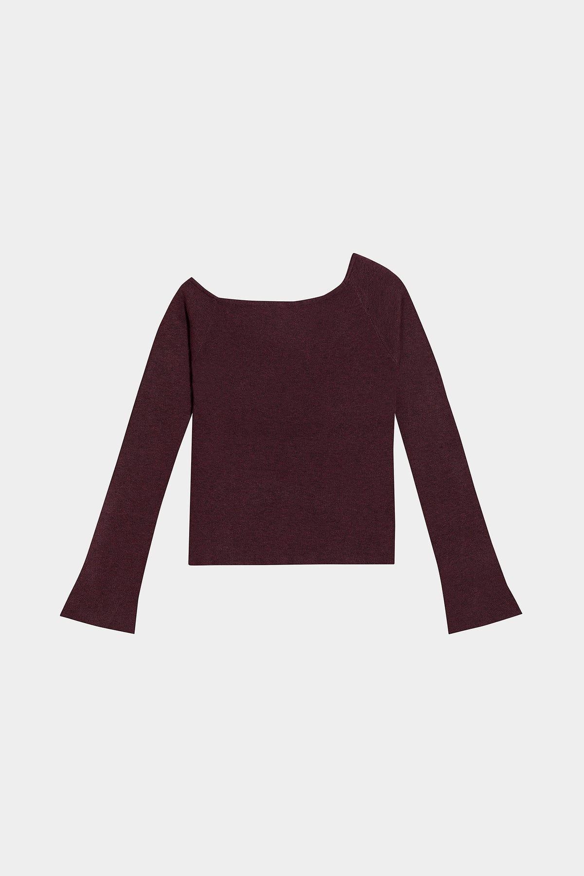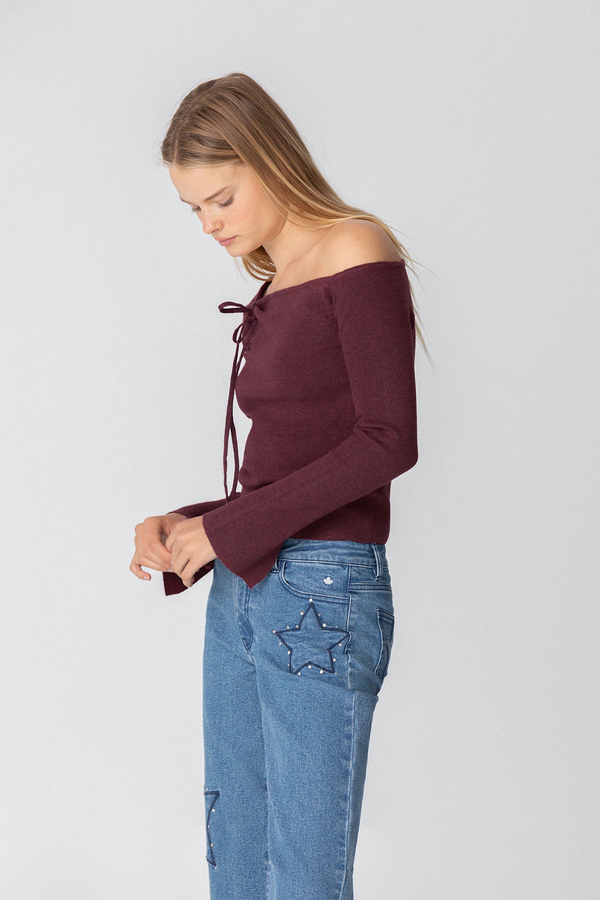 Camisola bordeaux com decote assimétrico, mangas à boca de sino e detalhe de laço na frente. Tecido macio e elástico que se ajusta ao corpo e realça as suas curvas. Faça dele um item essencial nesta estação!