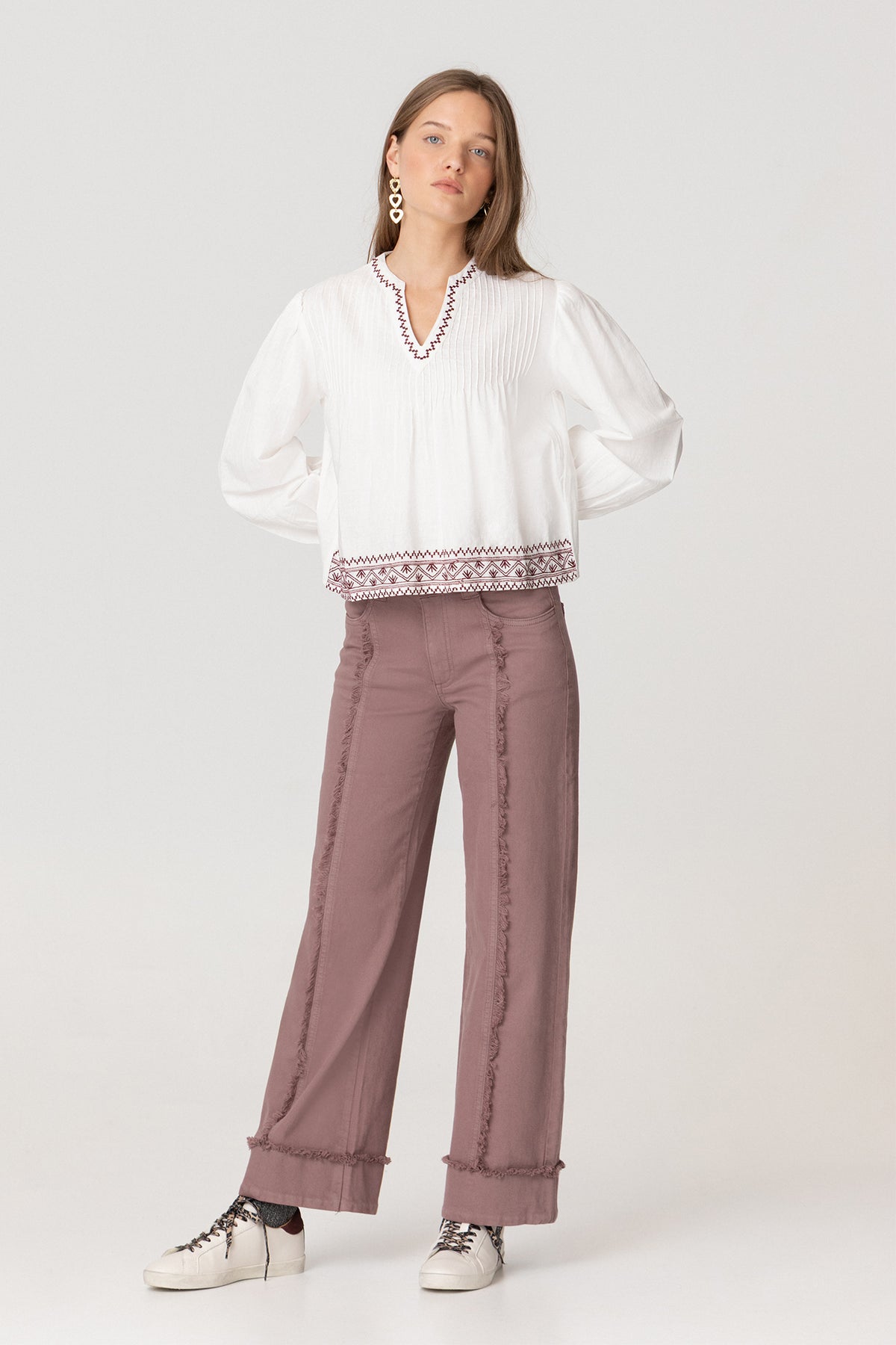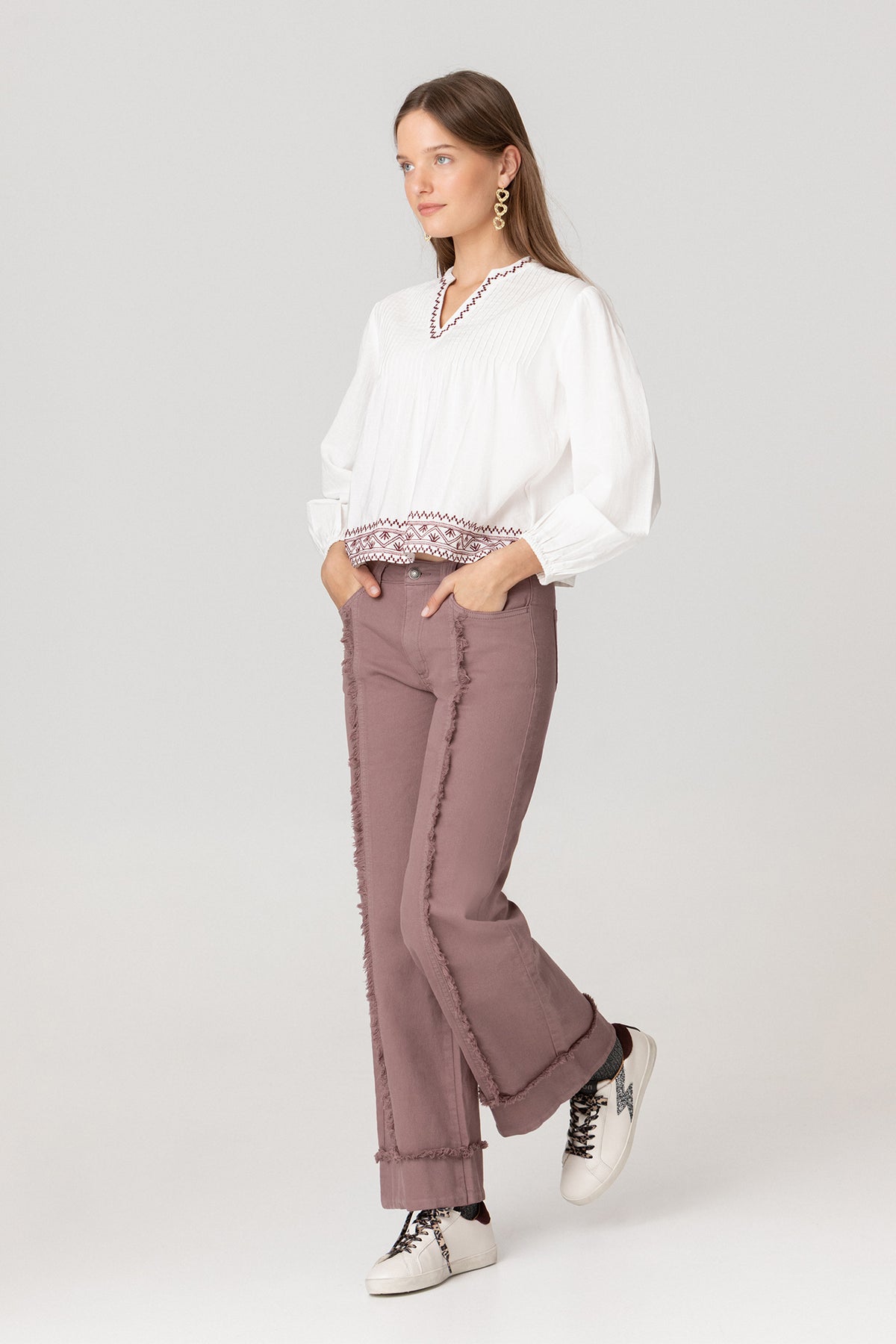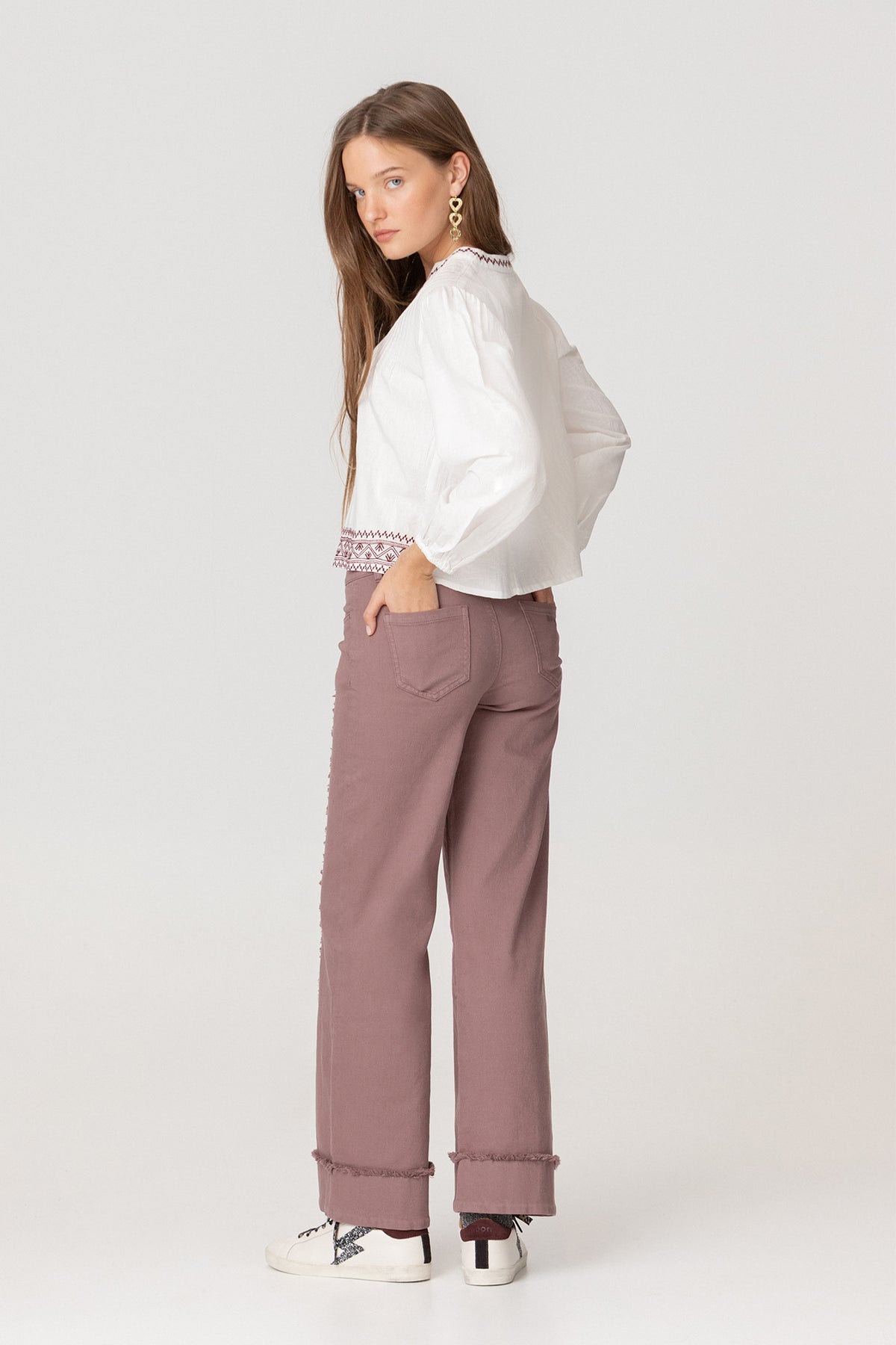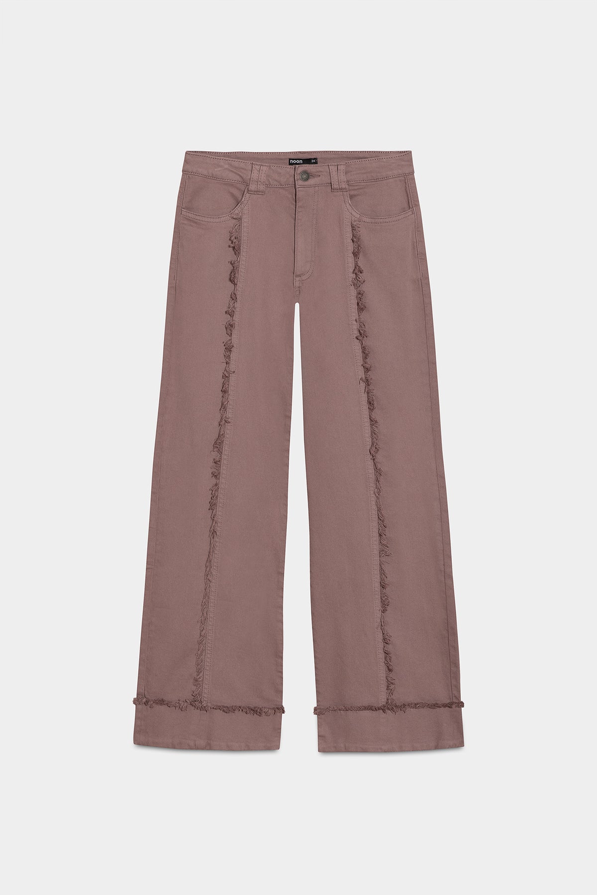 Calça de ganga reta de cintura baixa na cor terracota. Possui detalhes de costura desfiada na frente e na base. Garanta já um par de jeans exclusivo que vai ditar tendências nesta estação.