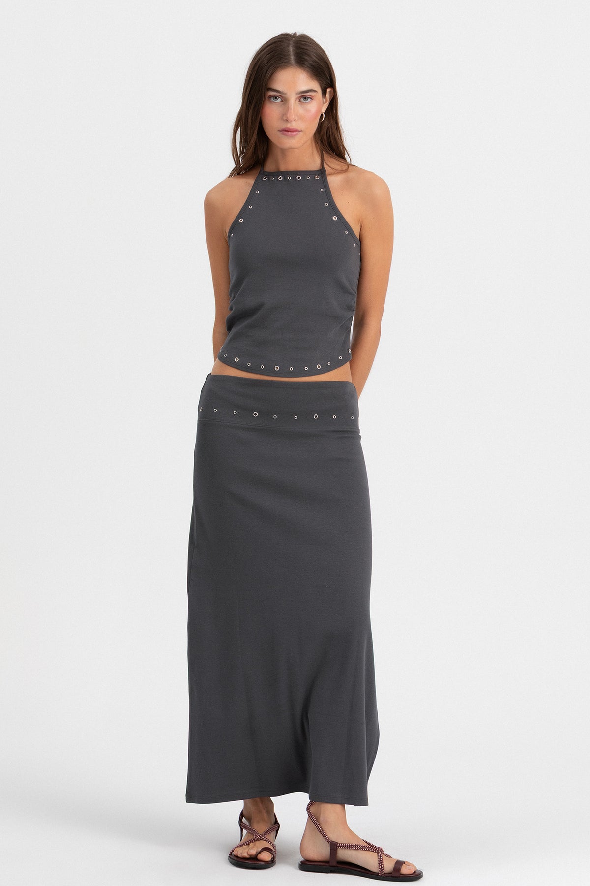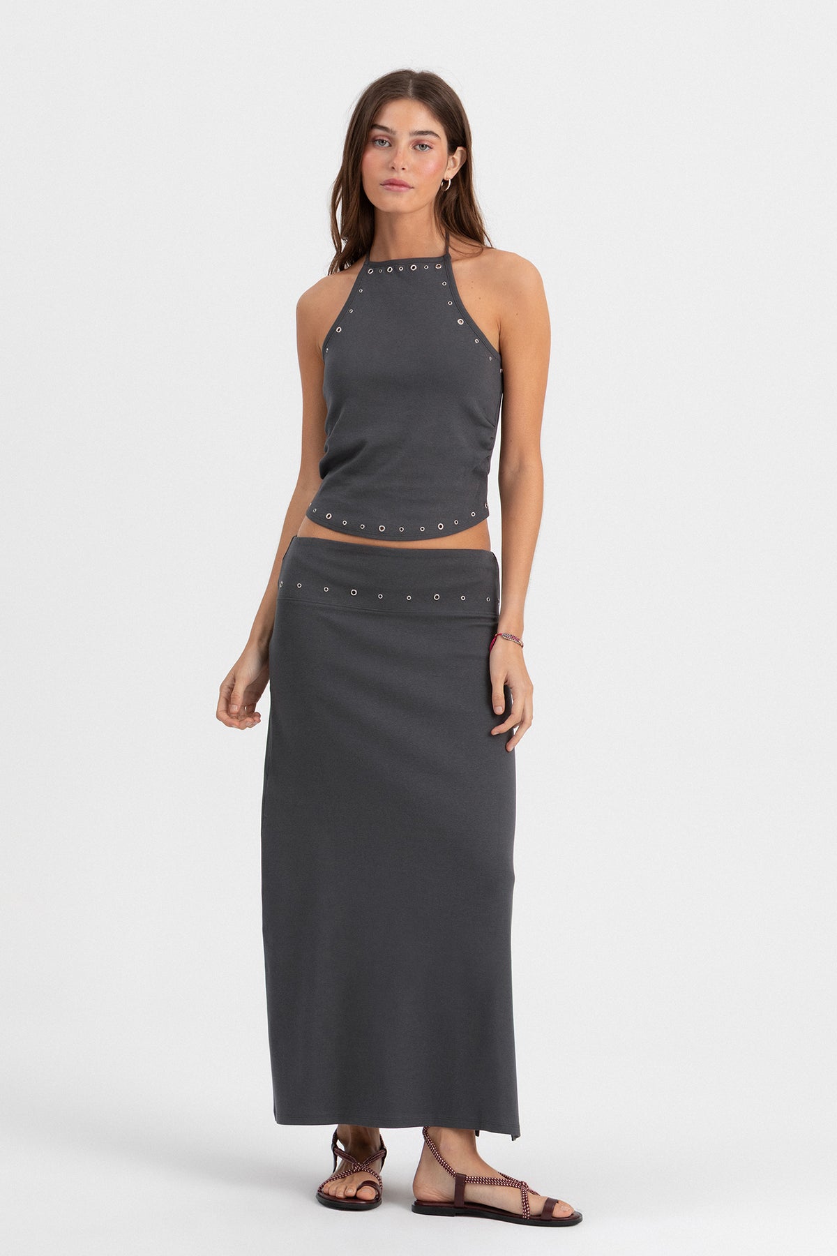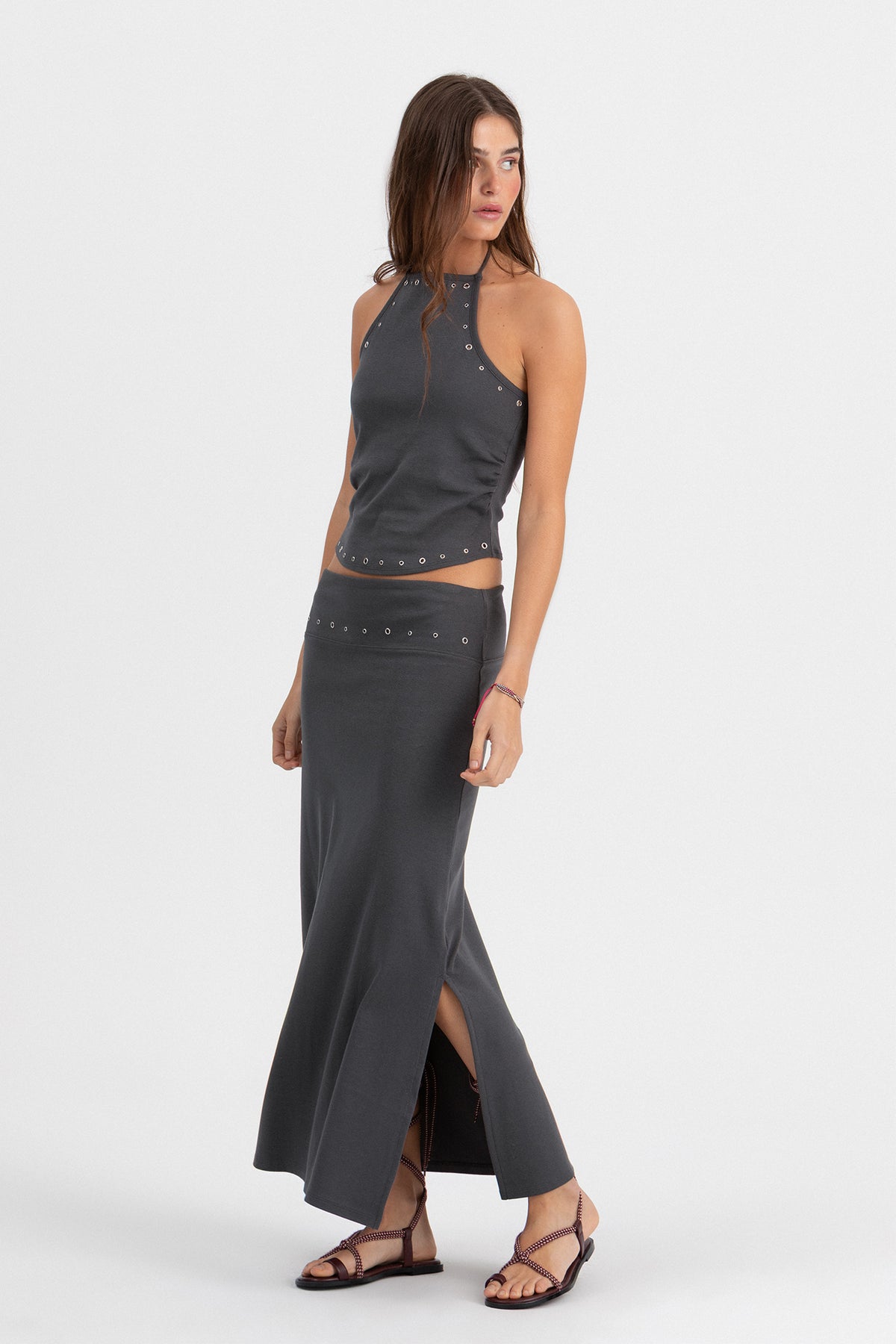 Saia Midi Cor Antracite com Detalhes Eyelets. Tecido elástico que se ajusta perfeitamente. Detalhe de ilhós na cintura. Abertura lateral que confere um toque jovem. Combine-a com o top a condizer e consiga um visual total completo!