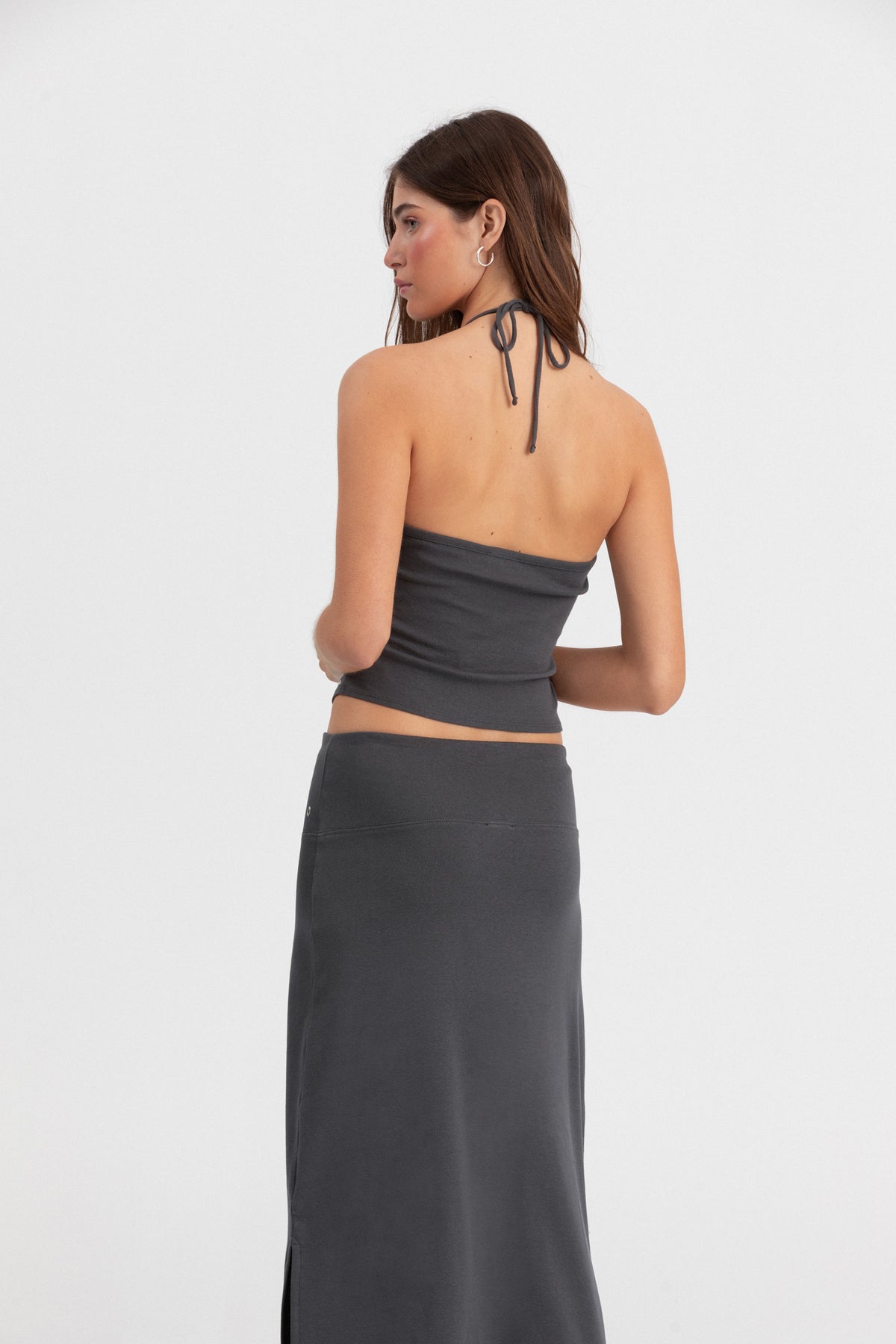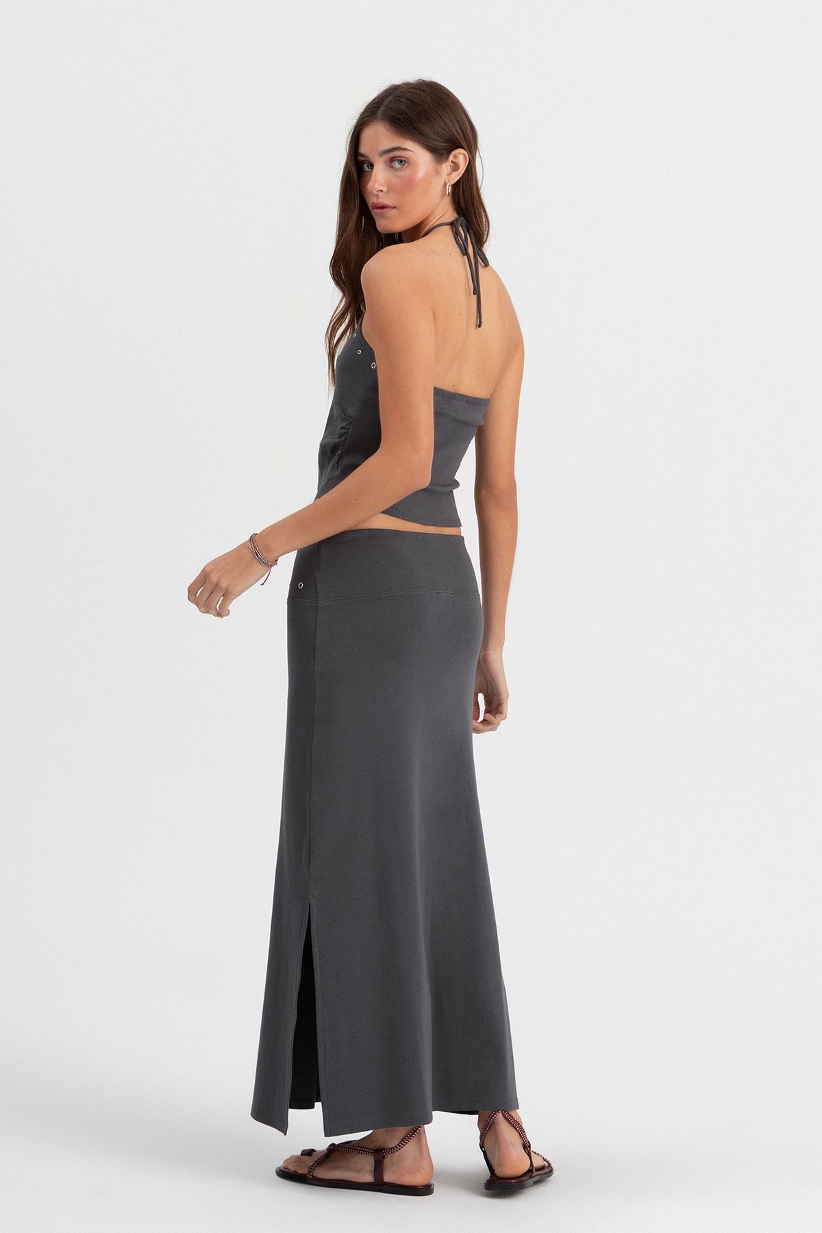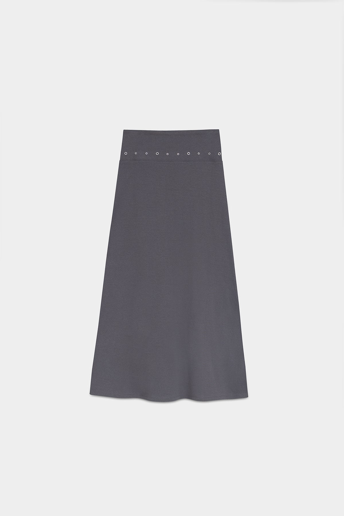 Saia Midi Cor Antracite com Detalhes Eyelets. Tecido elástico que se ajusta perfeitamente. Detalhe de ilhós na cintura. Abertura lateral que confere um toque jovem. Combine-a com o top a condizer e consiga um visual total completo!