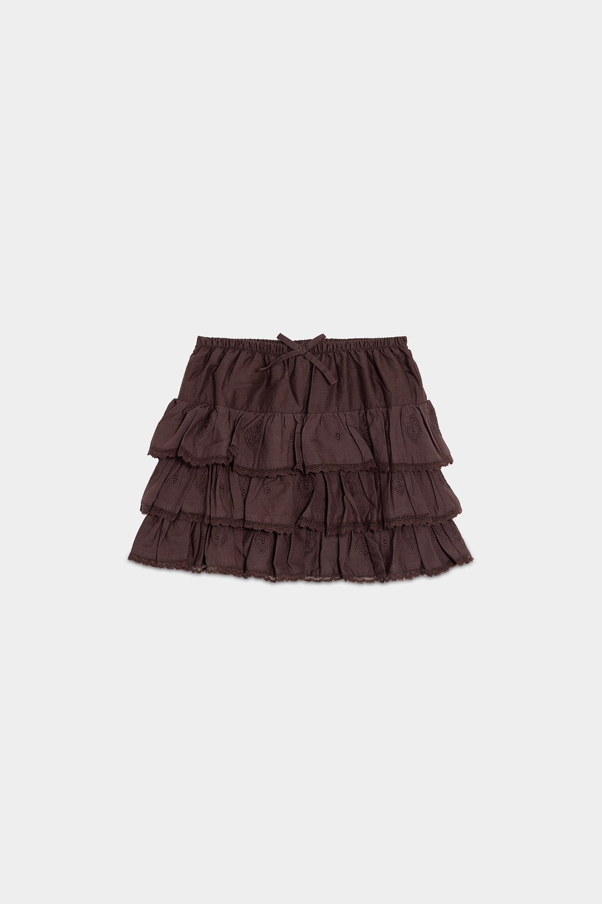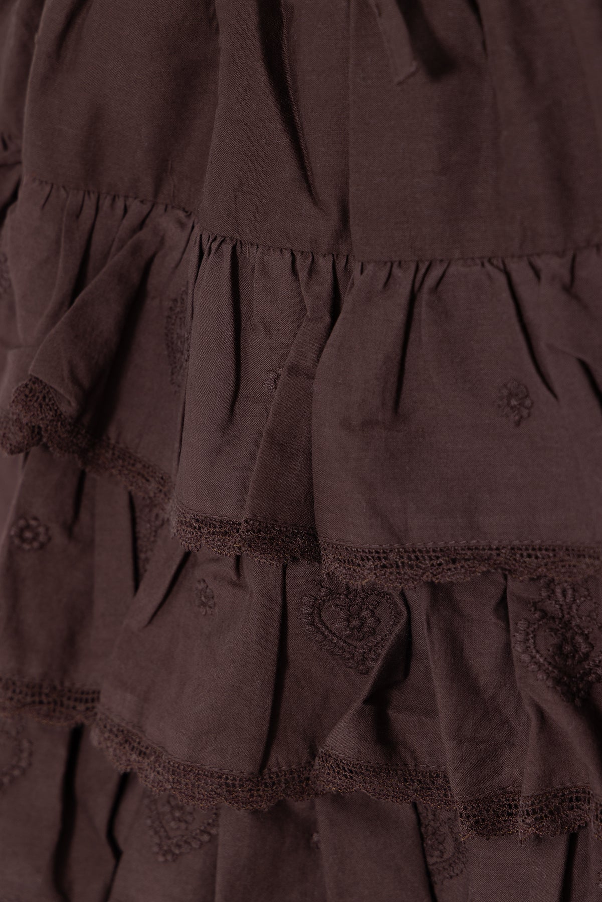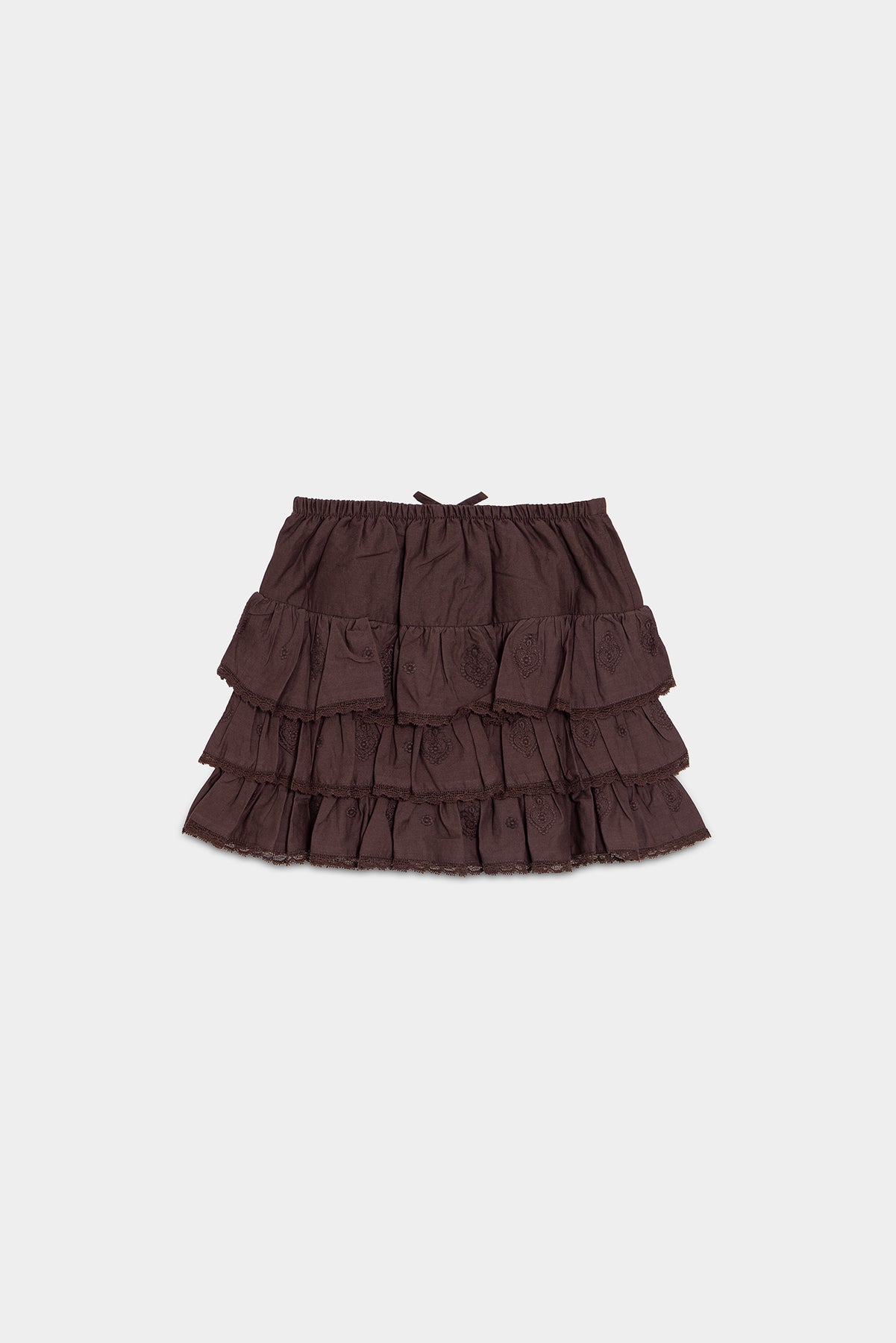 Saia Mini com Folhos cor Castanha. Cintura elástica para um ajuste perfeito. Três folhos com detalhe de bordados na peça. Tecido solto que realça a figura. Combine-a com o top de folhos a condizer para conseguir um look total!