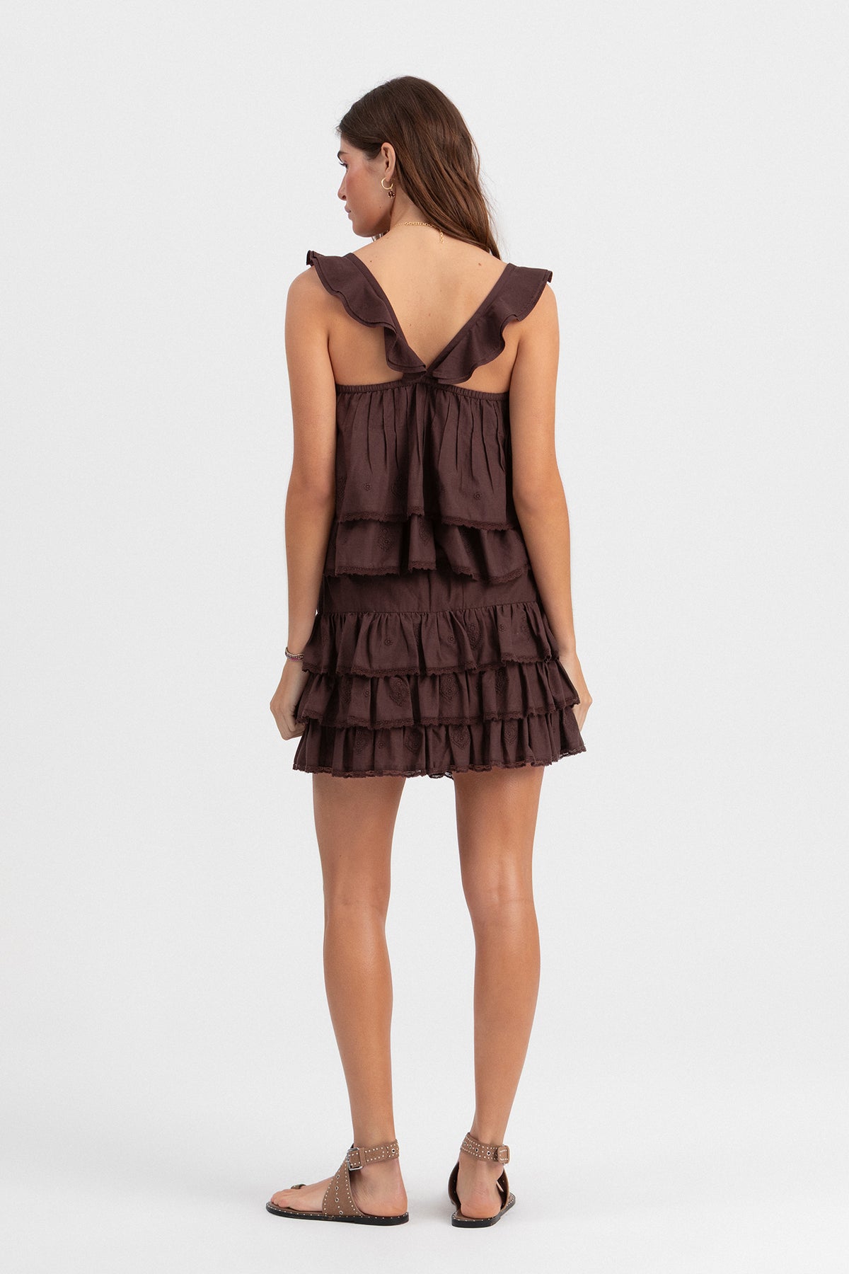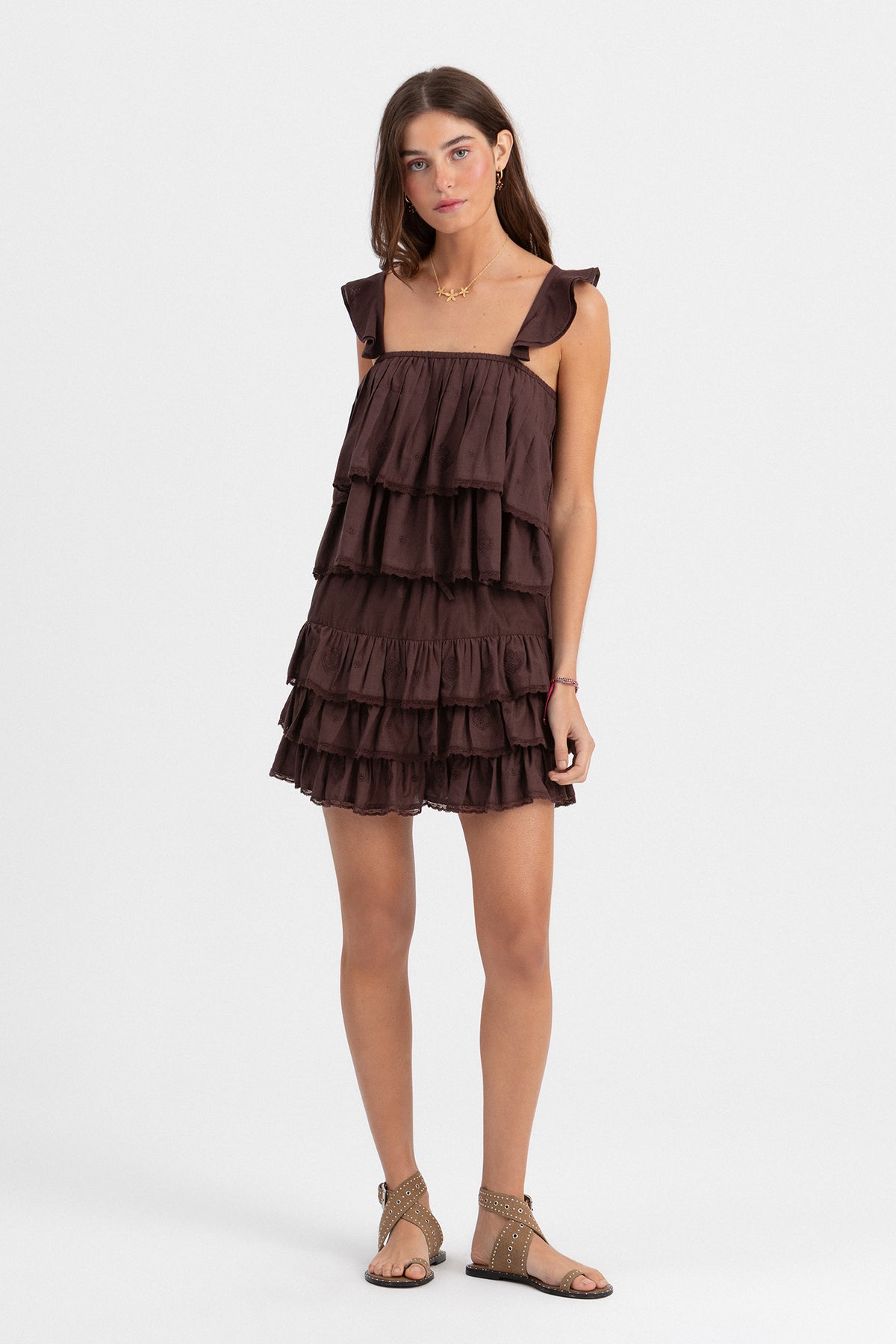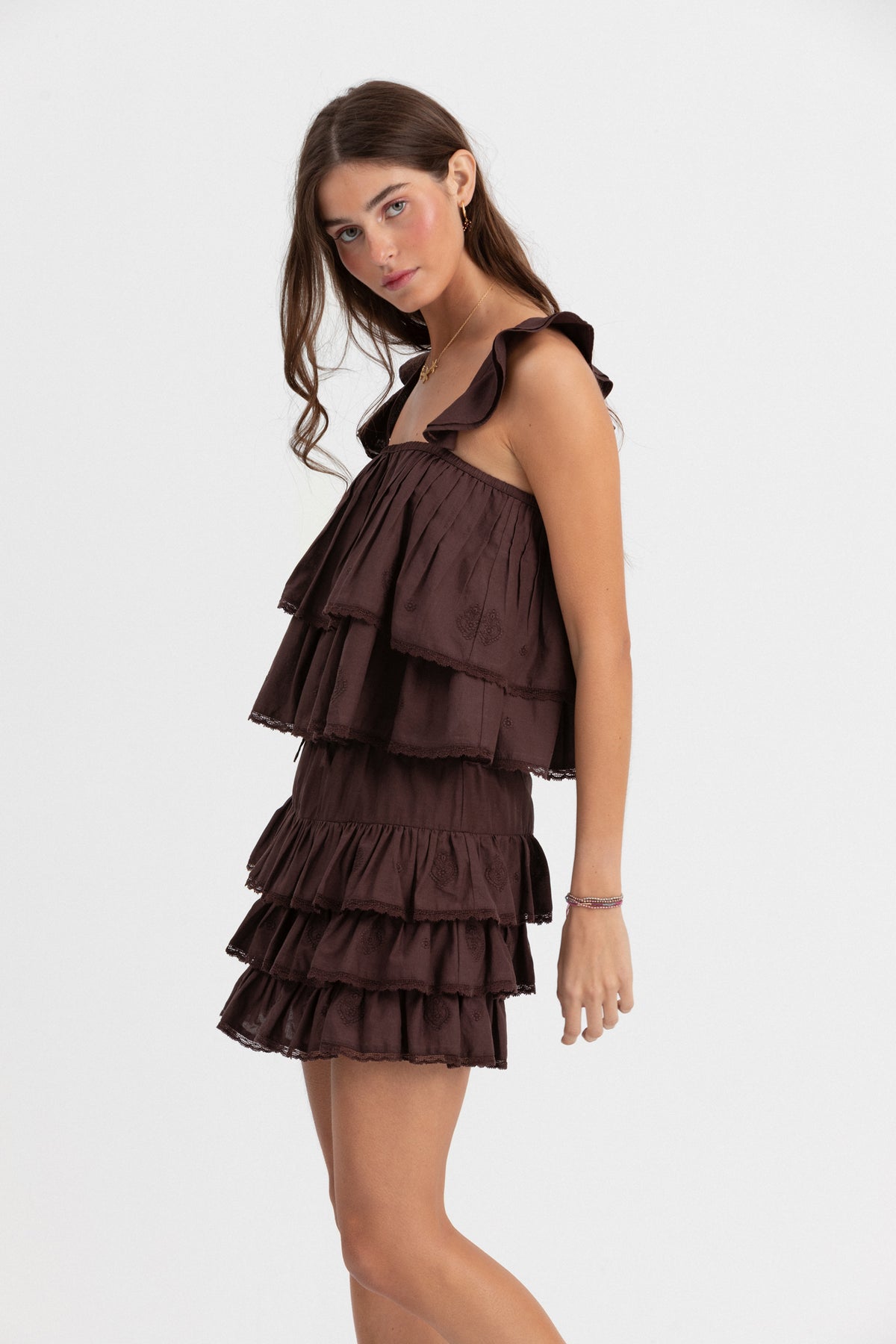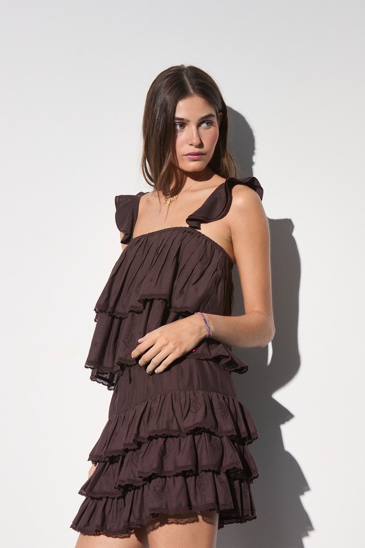 Saia Mini com Folhos cor Castanha. Cintura elástica para um ajuste perfeito. Três folhos com detalhe de bordados na peça. Tecido solto que realça a figura. Combine-a com o top de folhos a condizer para conseguir um look total!