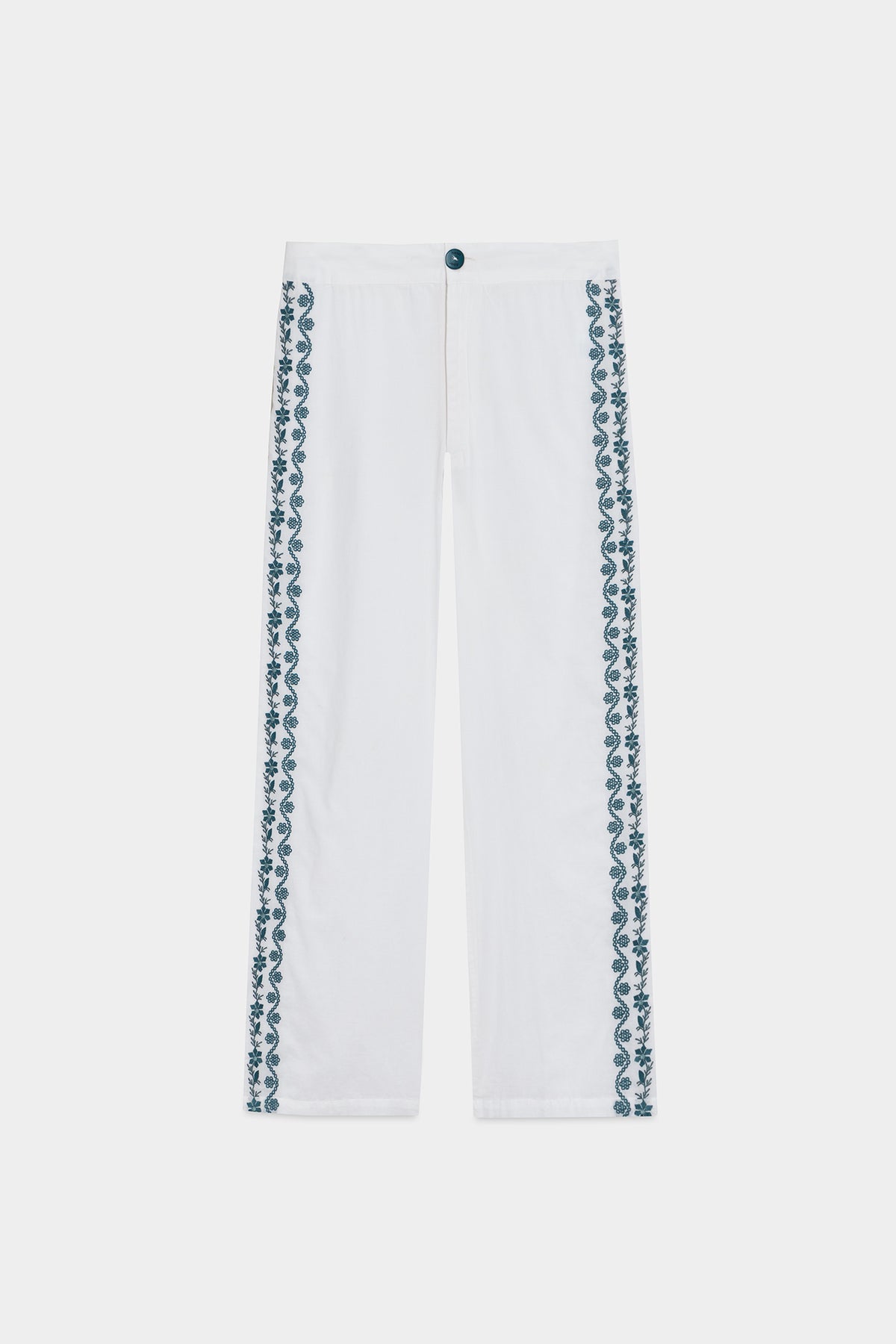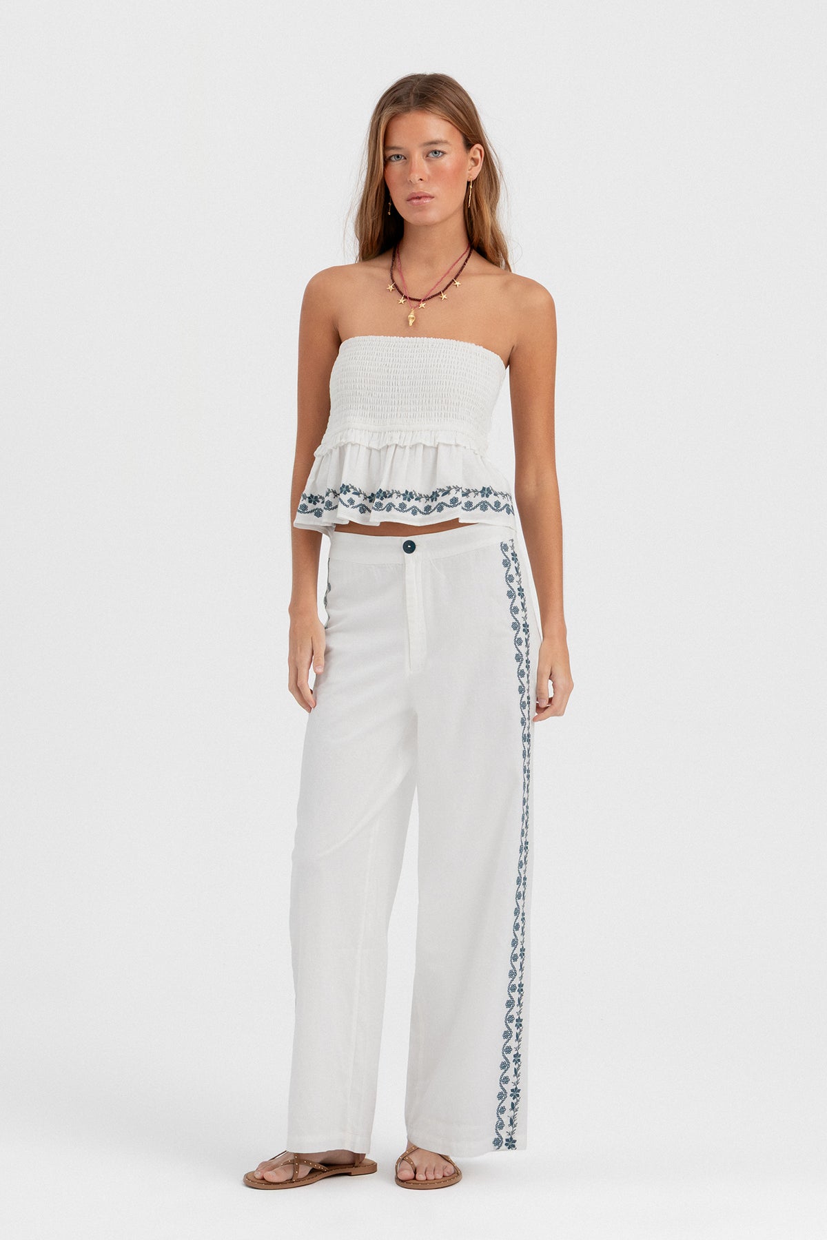 Pantalón Recto Blanco con Bordados en el Lateral. Talle medio y corte recto. Cierre con botón y cremallera frontal. Detalles de Bordados Floral. ¡Combínalo con el top bordado a juego para conseguir un look completo!