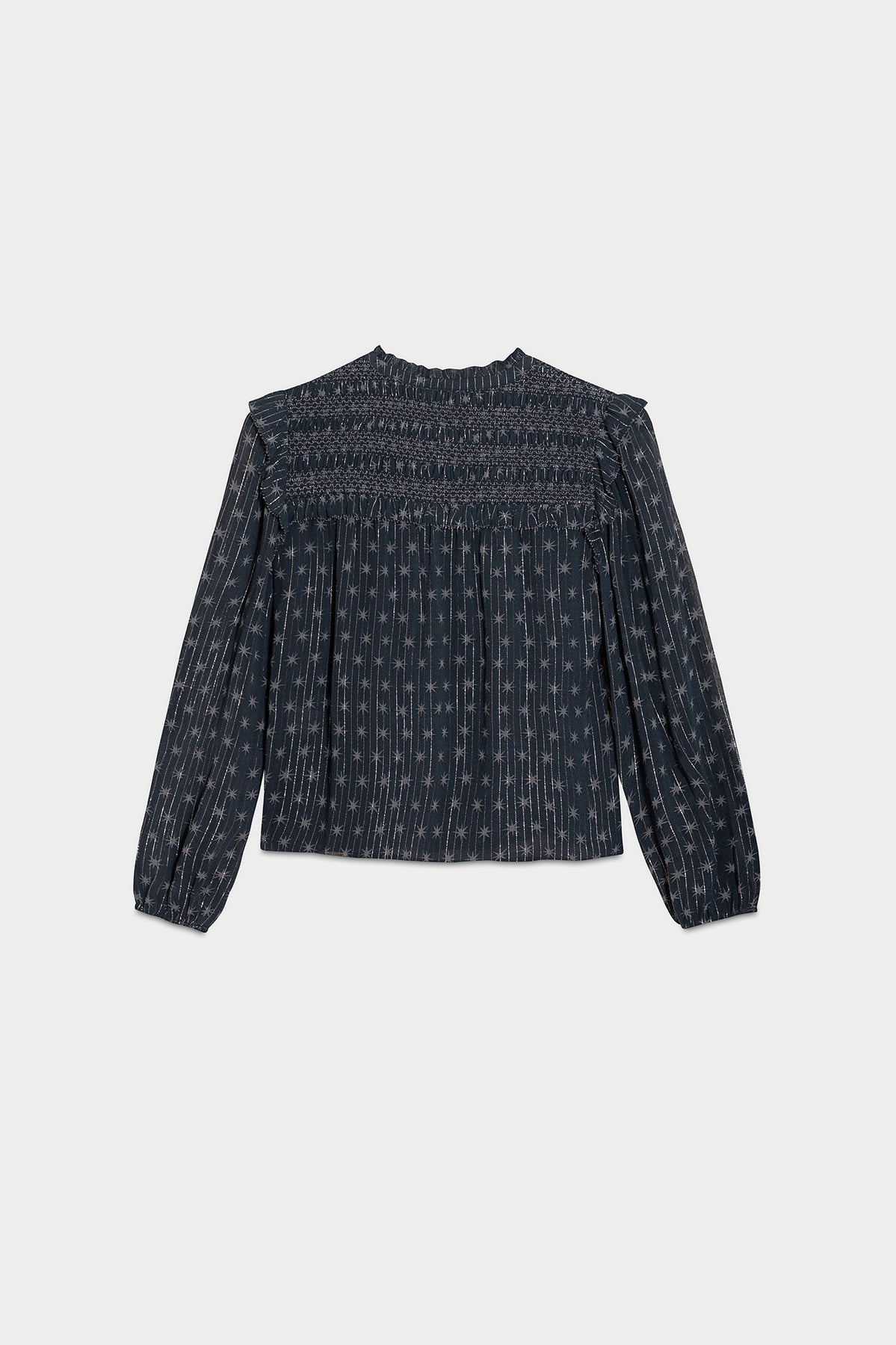Blusa fluida de manga comprida com estampado. Tecido lurex com efeito brilhante e detalhes franzidos. Amarração no pescoço para um ajuste perfeito. Combine com a minissaia franzida do mesmo estampado para um look completo e cheio de estilo!
